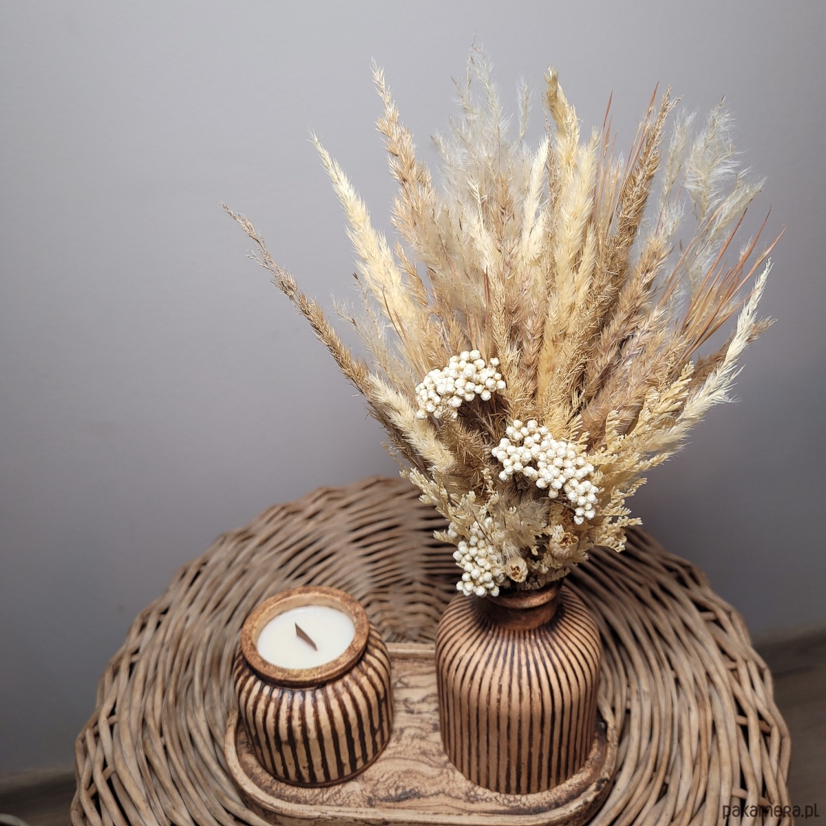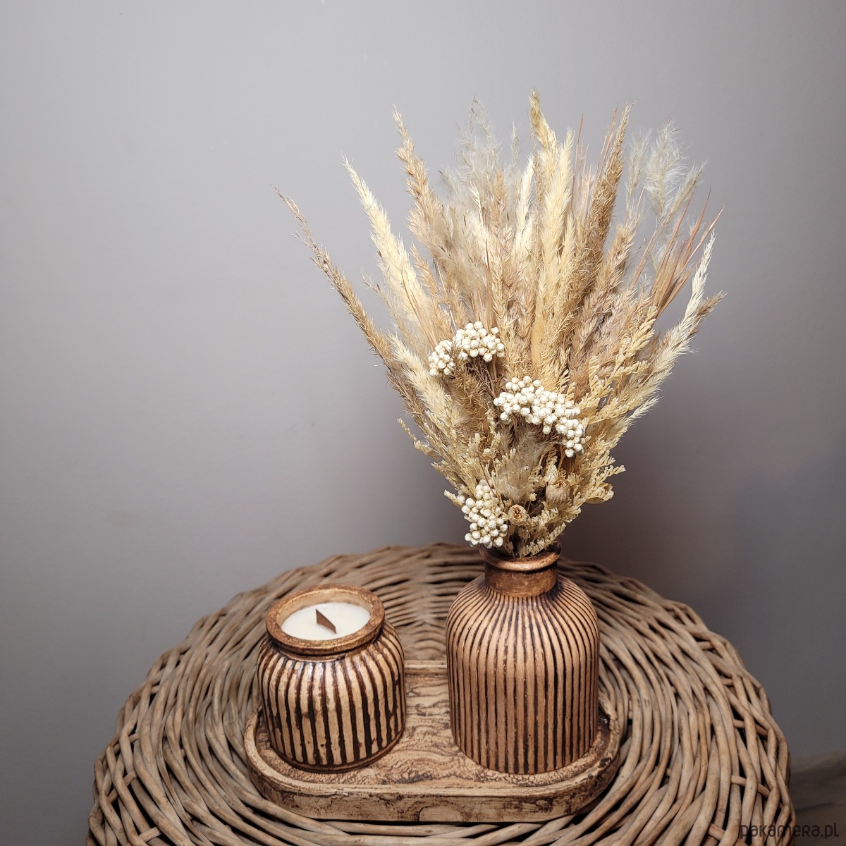 Stwórz przytulną atmosferę w swoim domu dzięki temu wyjątkowemu zestawowi! Wazony i świeczniki wykonane są z gipsu o fakturze imitującej naturalne drewno, a kompozycja z suszonych kwiatów dodaje wnętrzu subtelności i elegancji.
