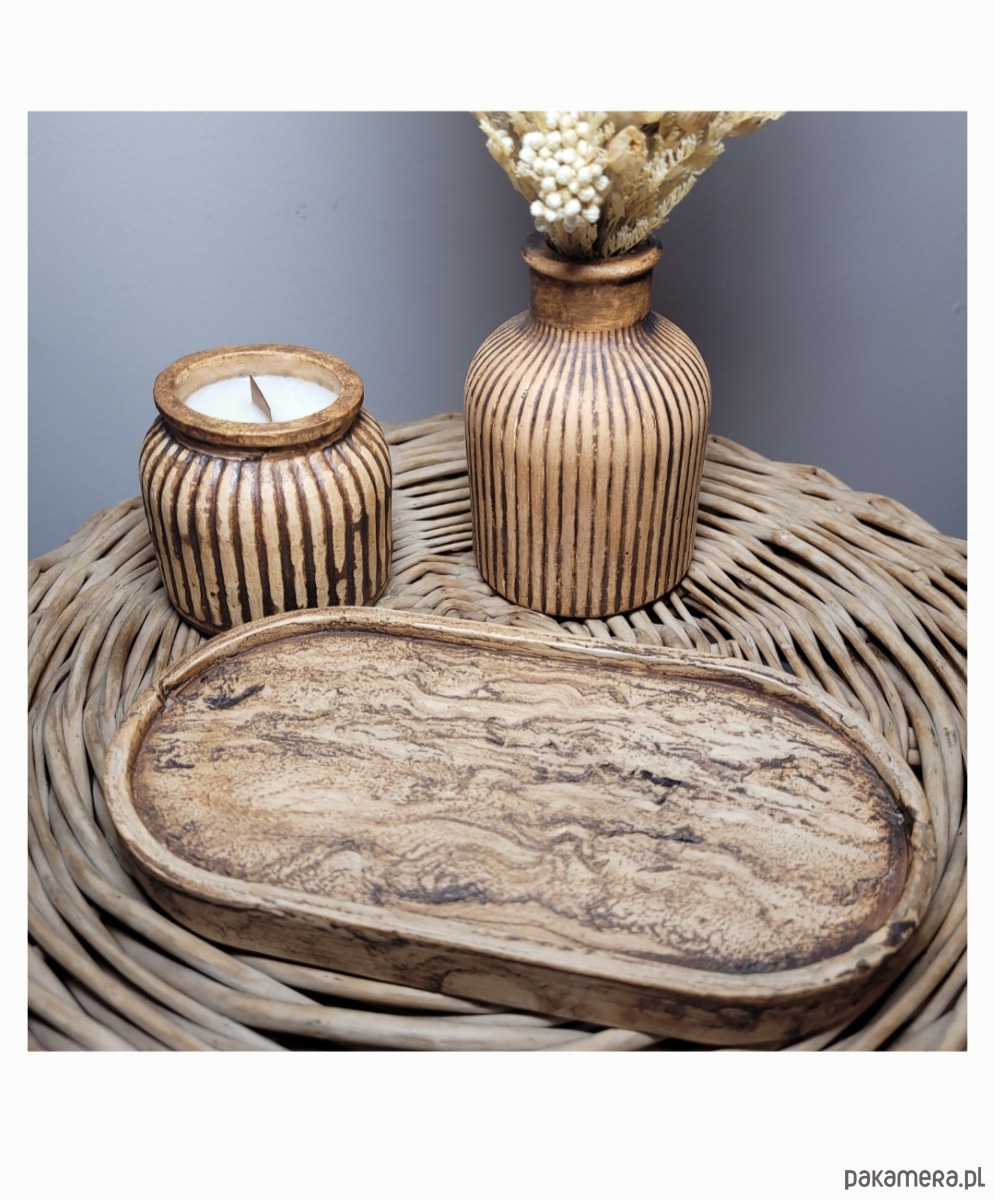 - Zestaw z gipsu– ręcznie zdobione, w ciepłych, ziemistych tonacjach.