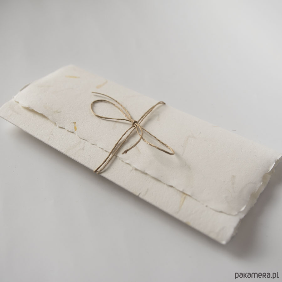 Minimalistyczna karta ślubna w formie składanego folderu. Powstała z przepięknego ręcznie czerpanego papieru z zatopionymi wewnątrz płatkami kwiatów. Przewiązana jest delikatnym cieniutkim sznureczkiem.