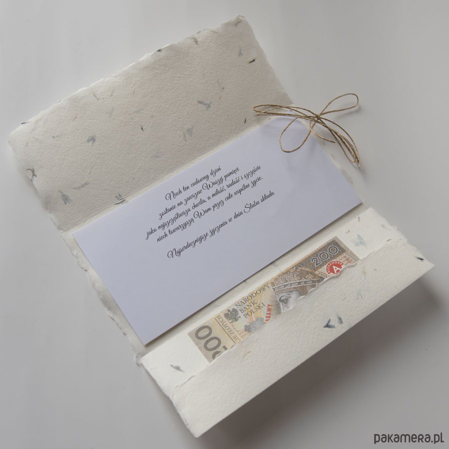 Minimalistyczna karta ślubna w formie składanego folderu. Powstała z przepięknego ręcznie czerpanego papieru z zatopionymi wewnątrz płatkami kwiatów. Przewiązana jest delikatnym cieniutkim sznureczkiem.