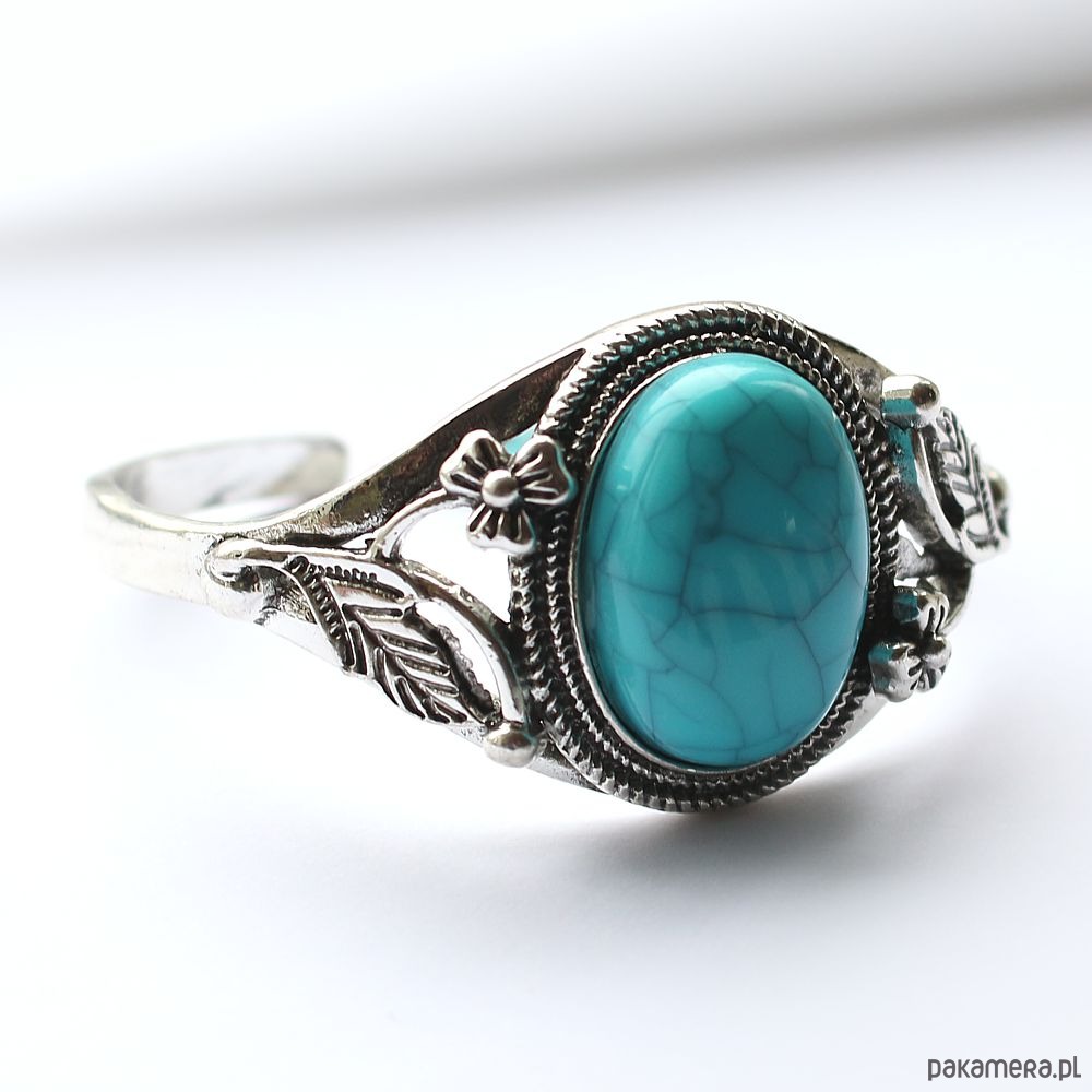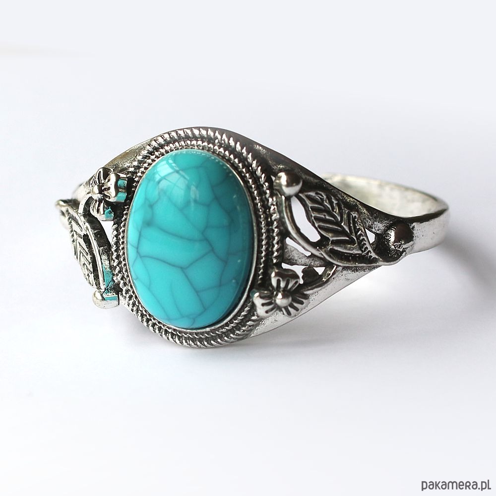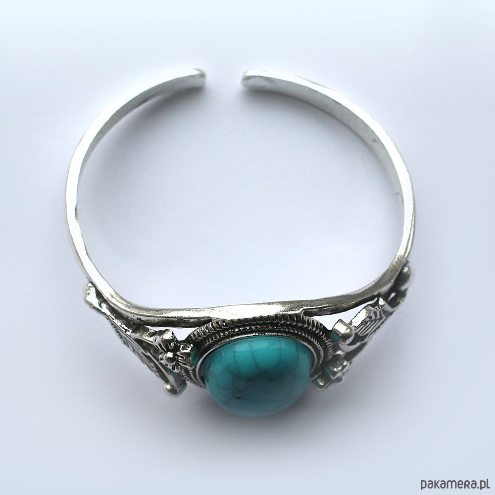 Unikatowa bransoletka otwarta z wygodną regulacją, ozdobiona turkusem. Pasować będzie zatem na każdy rozmiar nadgarstka.