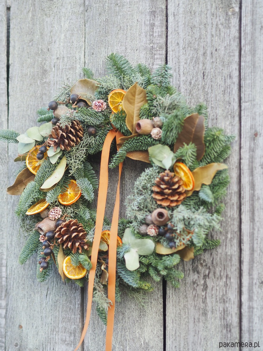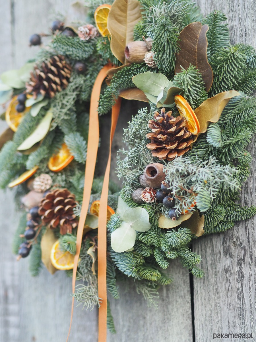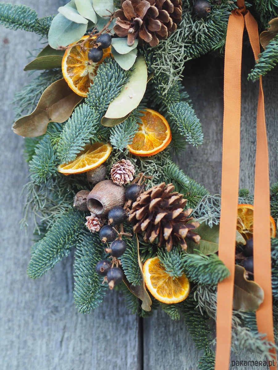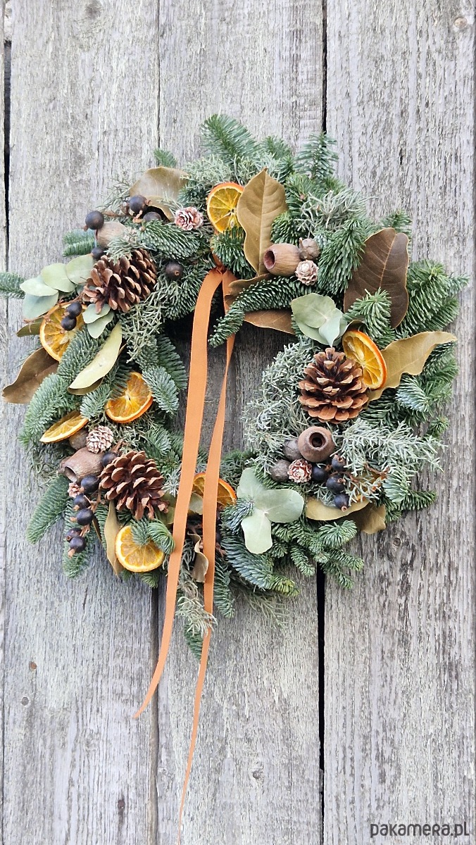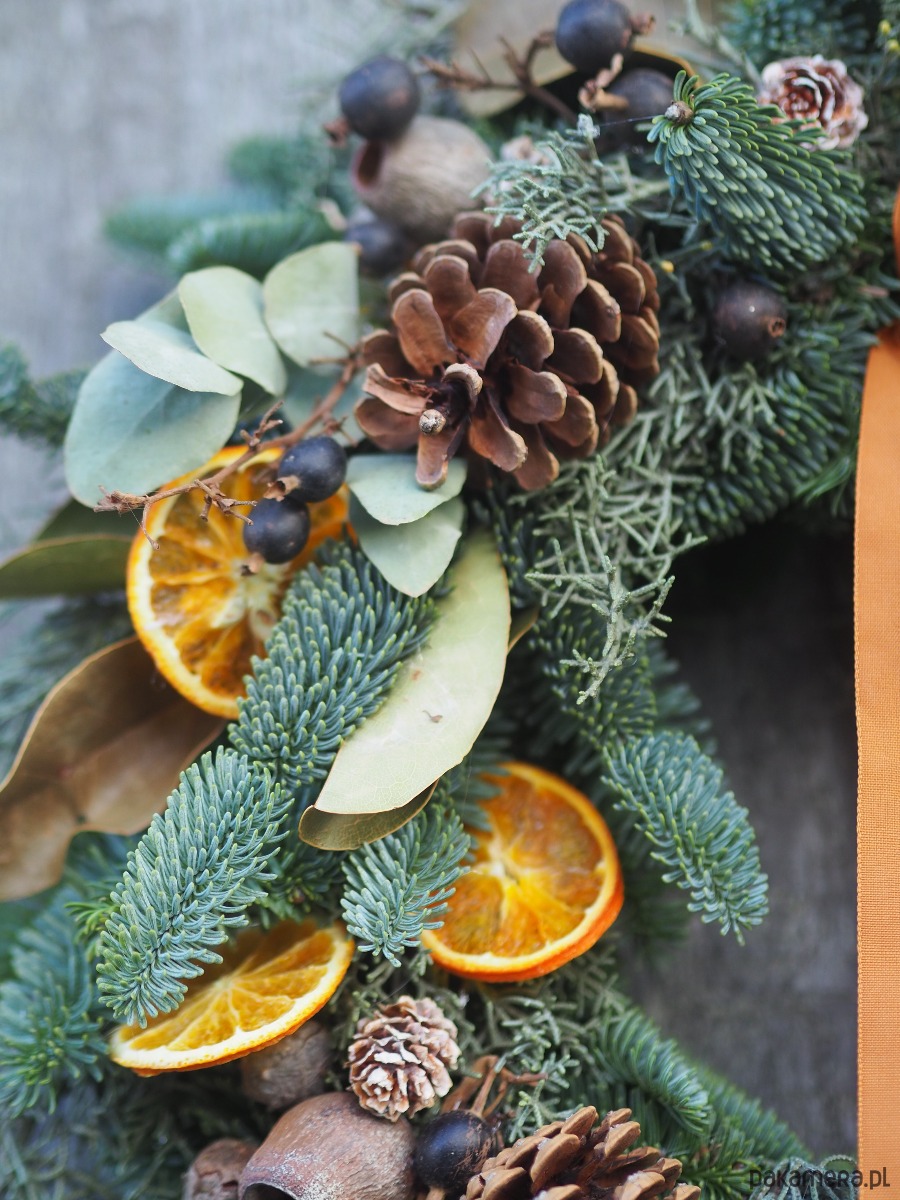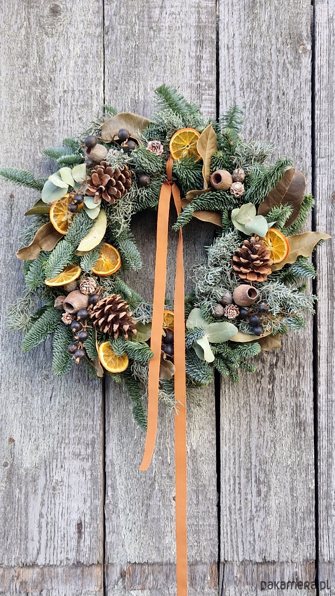 Ozdobiony jest szyszkami, suszonymi owocami eukaliptusa oraz oraz pomarańczami. Wianek w duchu EKO bez plastikowych elementów.