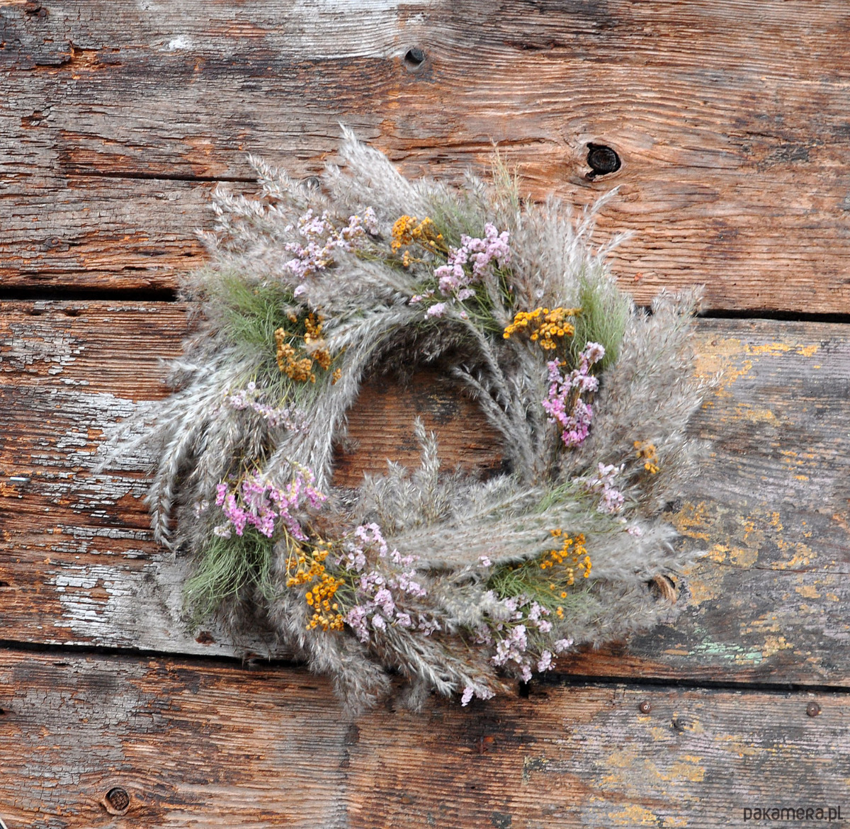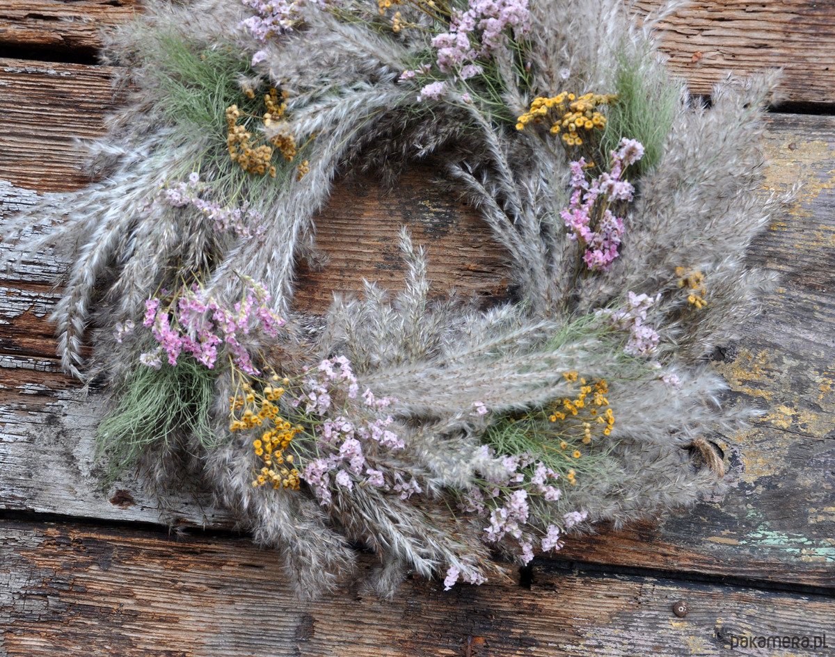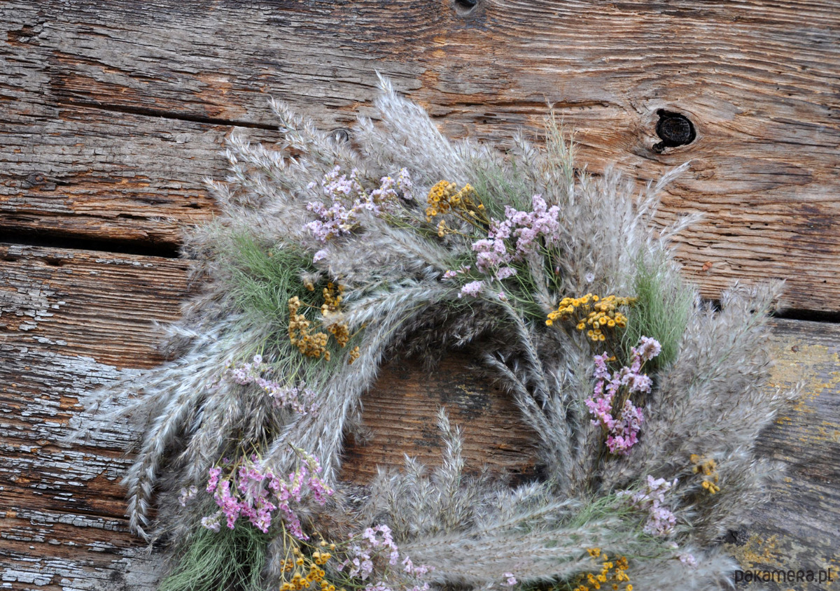 Piękny i wyjątkowy wianek boho z suszonych traw w kilku gatunkach i kwiatów, min. wrotyczu, skrzypu i zatrwianu, ; średnica ok.46cm; wianek jest przystosowany do powieszenia np. na drzwiach, ścianie, w oknie; wykonany na słomianej bazie; wianki występują w pojedynczych egzemplarzach, nie ma możliwości powtórzenia wzoru; zapraszam serdecznie