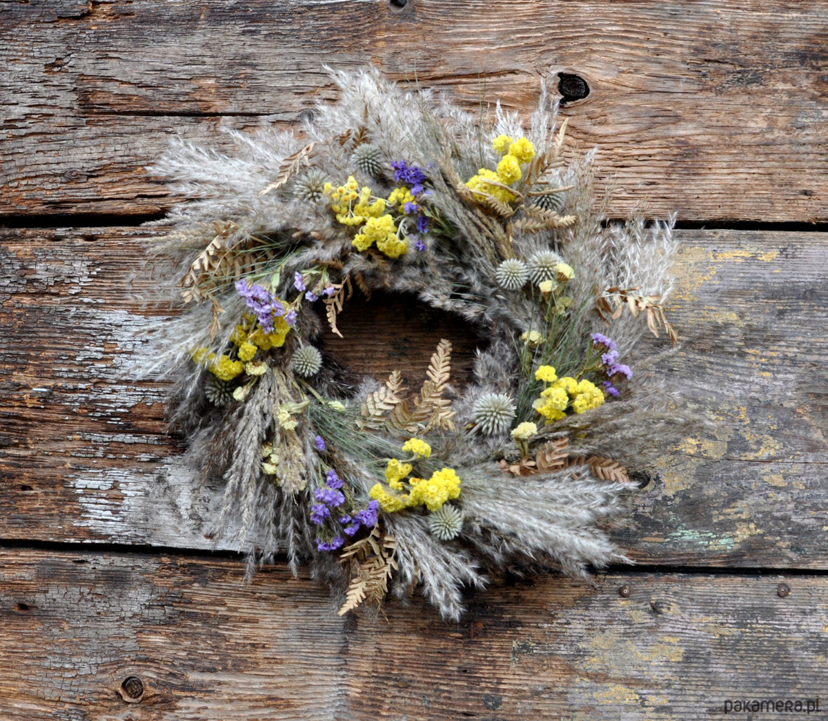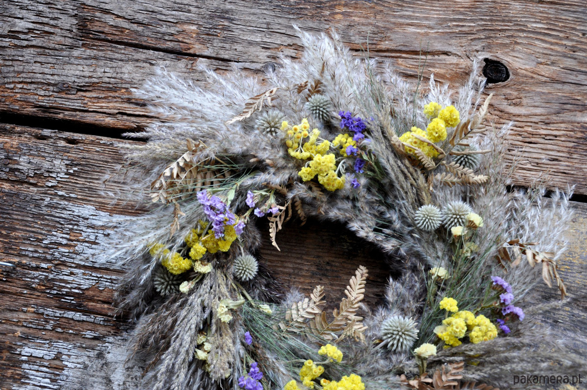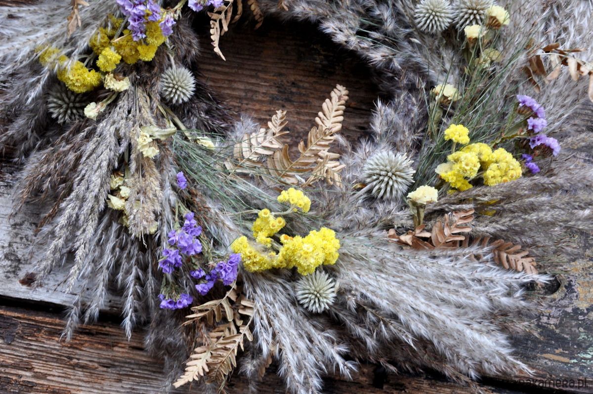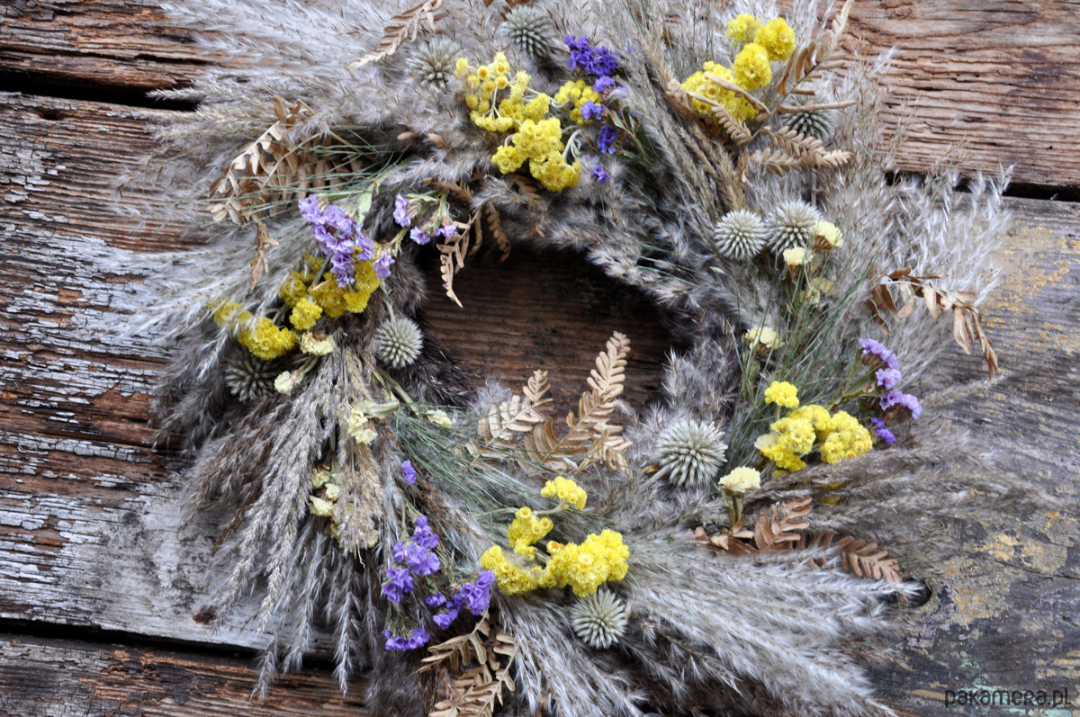 Piękny i wyjątkowy wianek boho z suszonych traw w kilku gatunkach i kwiatów min. przegorzanu, kocanki piaskowej, zatrwianu; średnica ok.46cm; wianek jest przystosowany do powieszenia np. na drzwiach, ścianie, w oknie; wykonany na słomianej bazie; wianki występują w pojedynczych egzemplarzach, nie ma możliwości powtórzenia wzoru; zapraszam serdecznie
