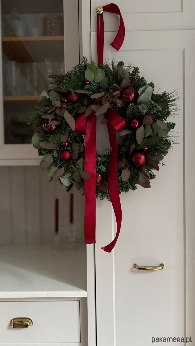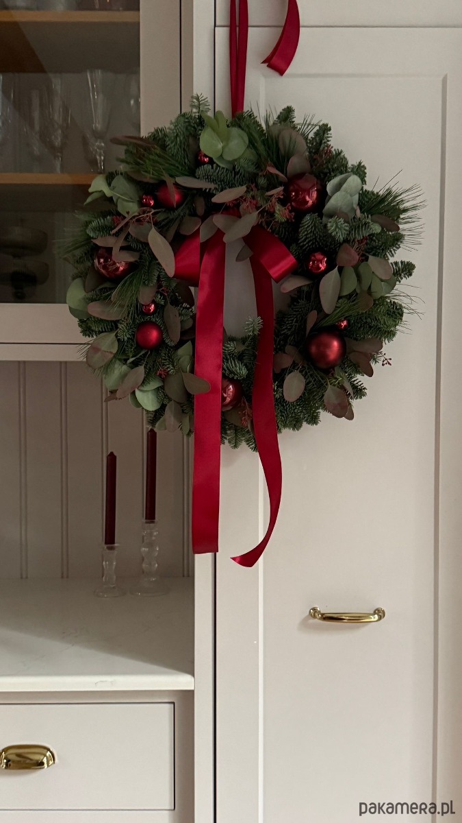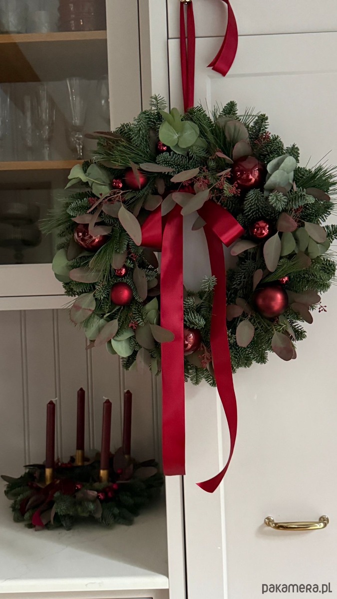Połączenie szlachetnej Jodły Nobilis z dodatkiem sezonowego igliwia oraz burgundowych bombek , przepasany atłasową czerwono-bordową wstążką.
