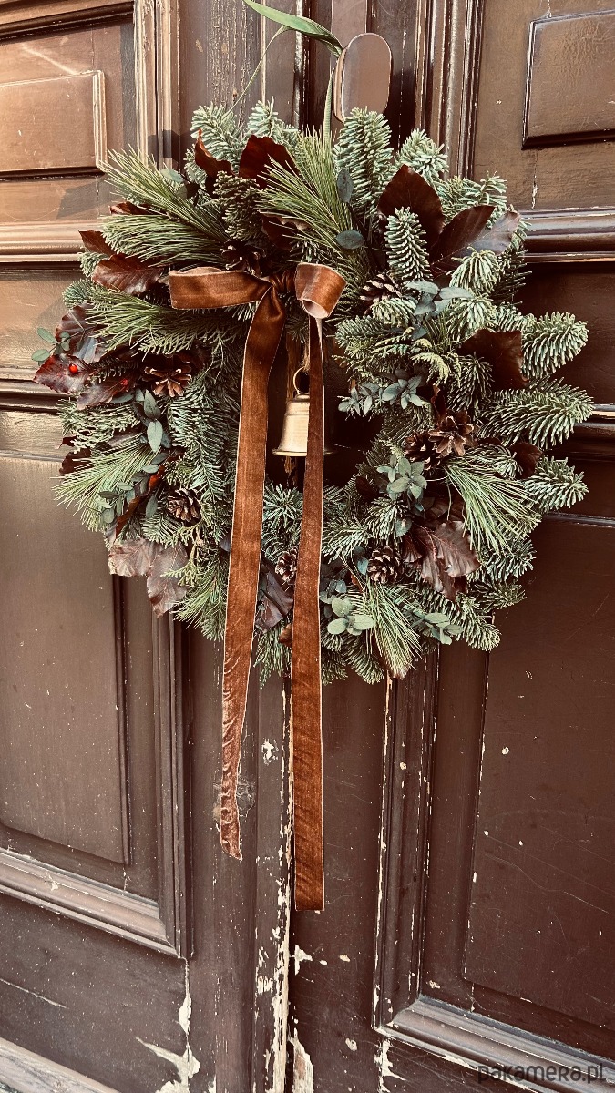 Połączenie szlachetnej Jodły Nobilis z dodatkiem sezonowego igliwia oraz stabilizowanych, brązowych liści, przepasany aksamitną brązową wstążką.