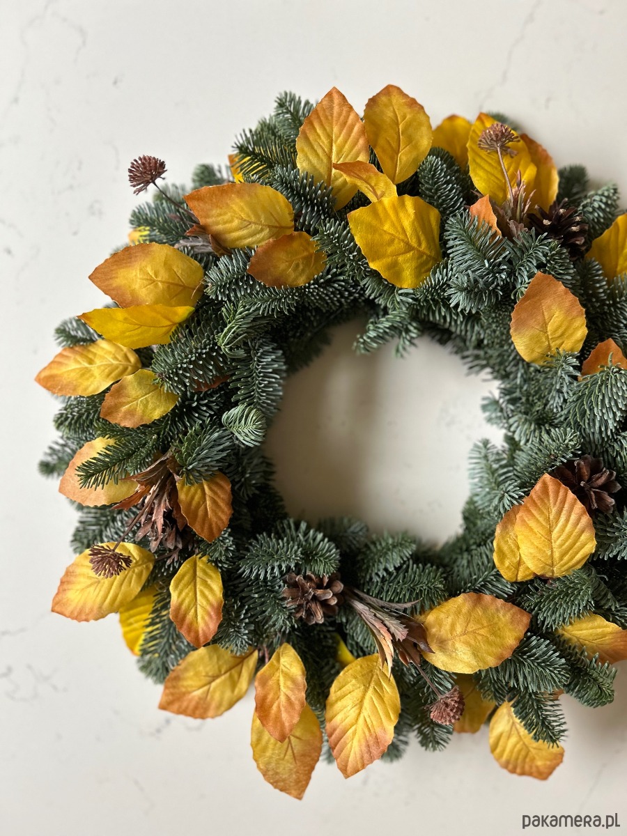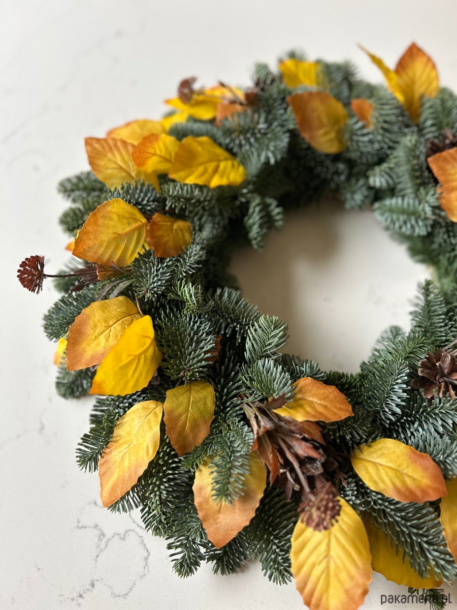 Wianek naturalny, wykonany z wysokiej jakości Jodły Nobilis. Dodatkiem są sztuczne, naturalnie wyglądające dekoracje.