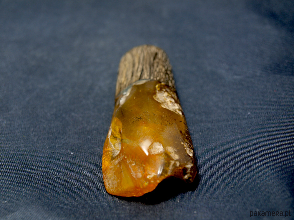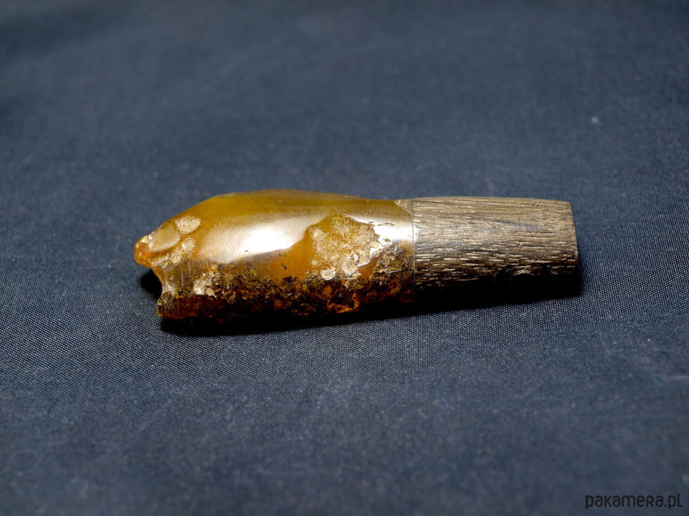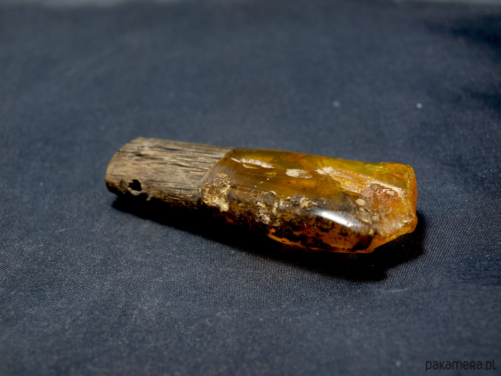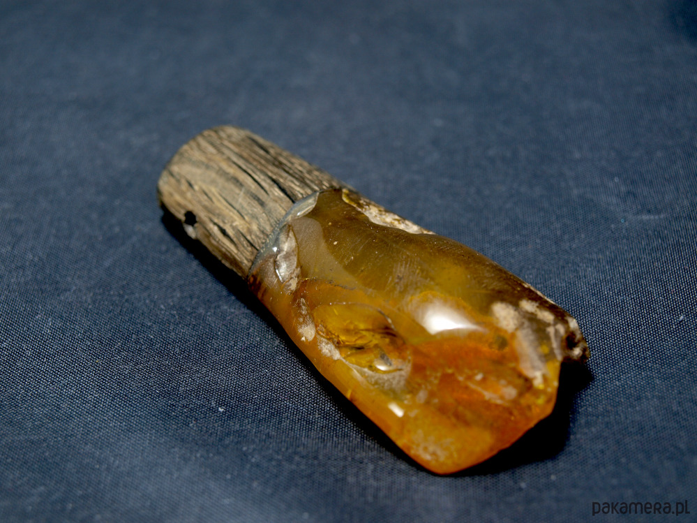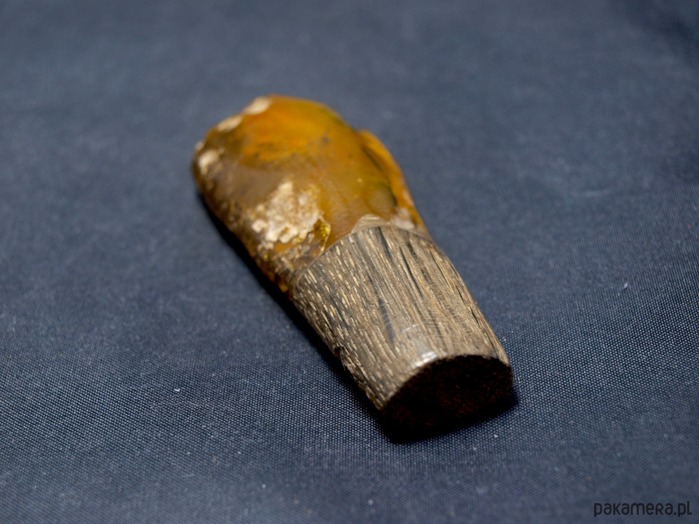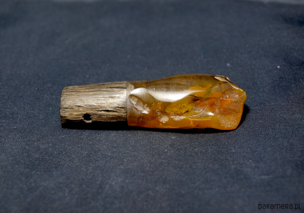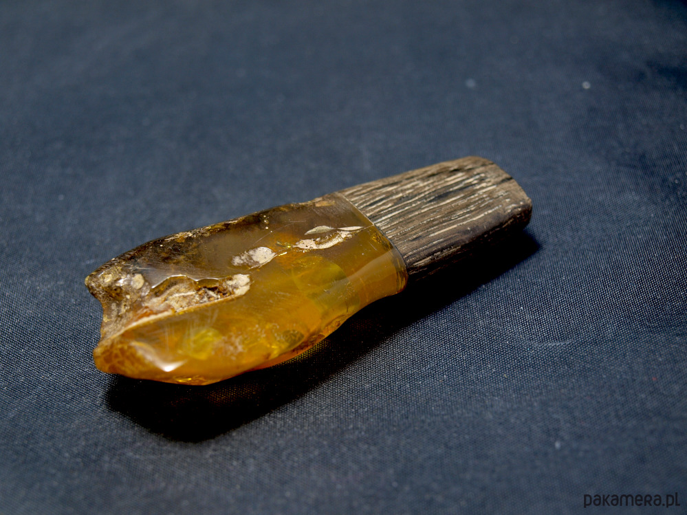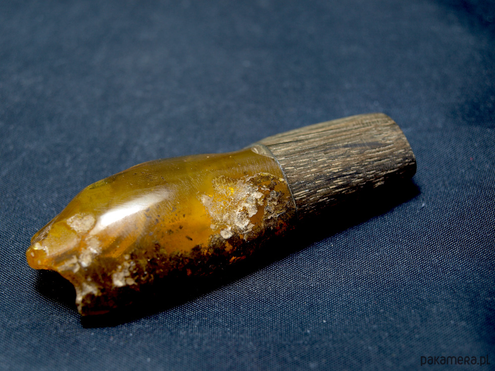 Wisiorek składa się z jednego kawałka bursztynu umieszczonego na kawałku drewna, czarnego dębu z kanału panamskiego.
