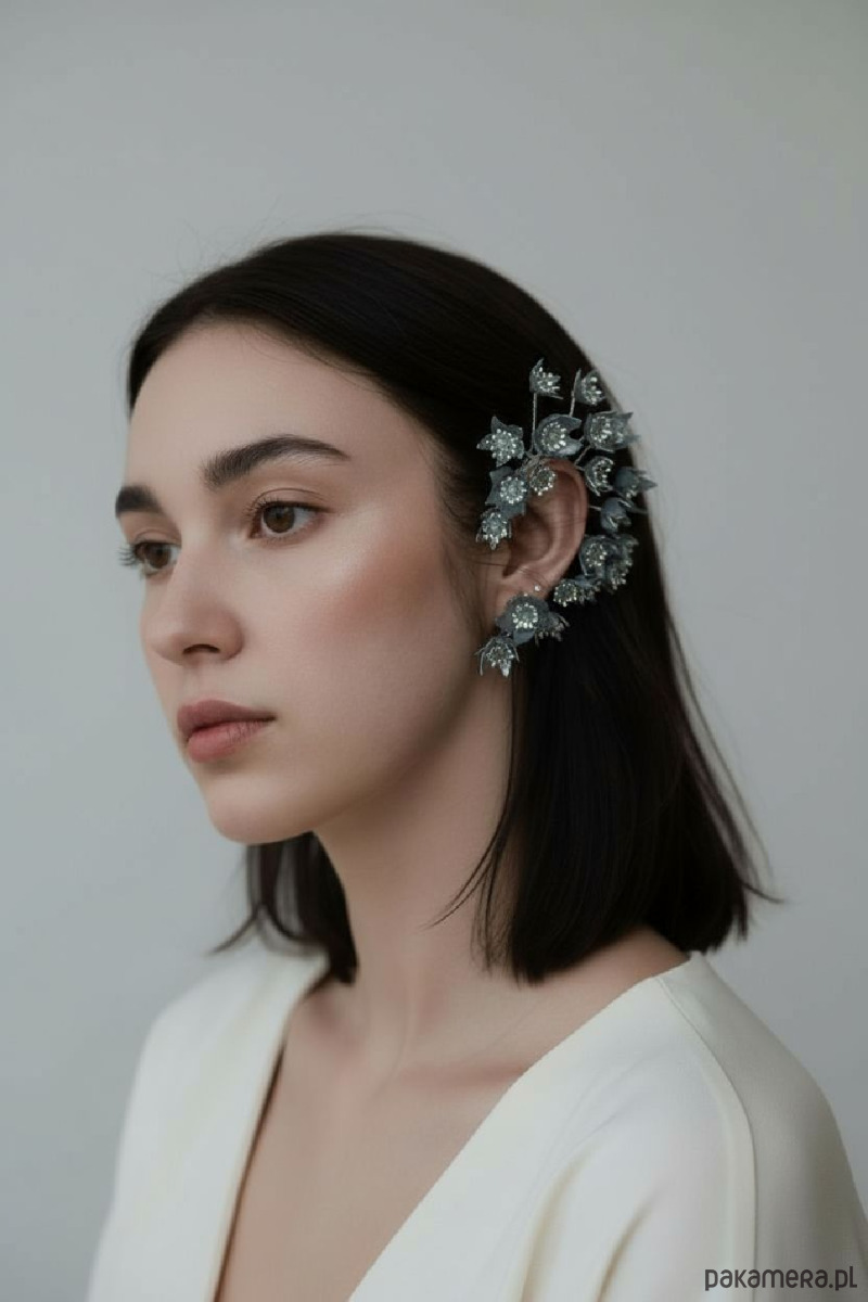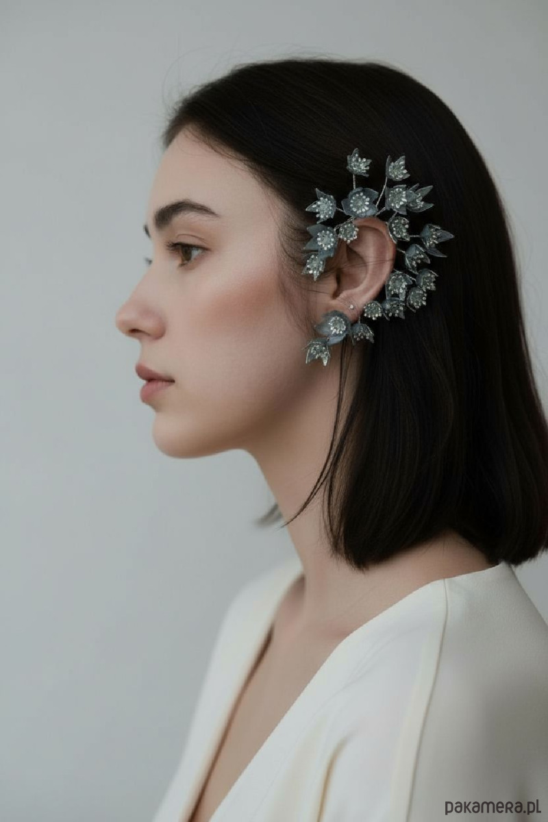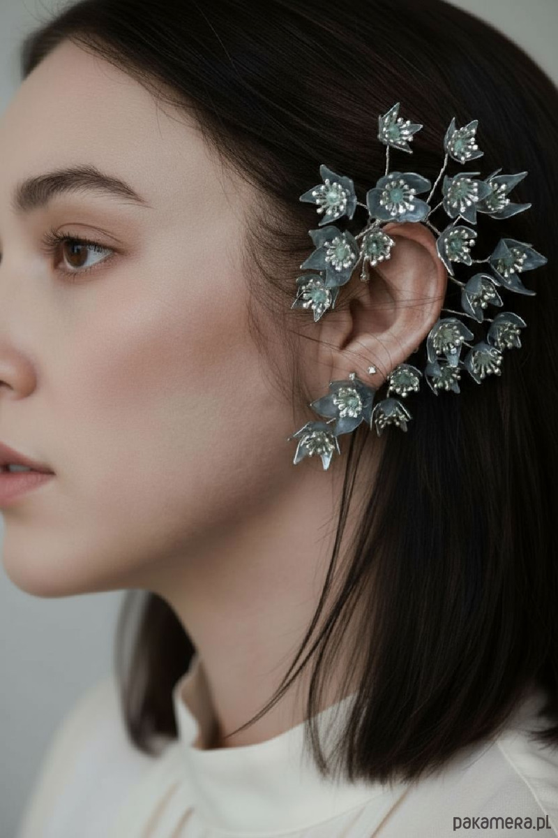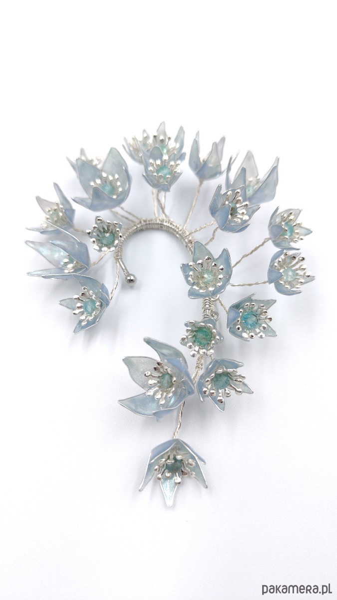 Kwiatowa nausznica LUANE wykonana z drutu jubilerskiego i żywicy niesamowicie prezentuje się w subtelnych odcieniach srebrzystego błękitu, które doskonale współgrają z każdą stylizacją. Nausznica ozdobiona jest bajkowymi kwiatami, których delikatne płatki wprowadzają odrobinę romantyzmu . W centrum każdego kwiatu zamontowane są metalowe pręciki, które otaczają koraliki z naturalnego kamienia jakim jest Apatyt. Kamień Apatyt wspiera motywację, naturalny entuzjazm i chęć do działania. pobudza kreatywność jest idealnym kamieniem do medytacji, działa ochronnie jak talizman.