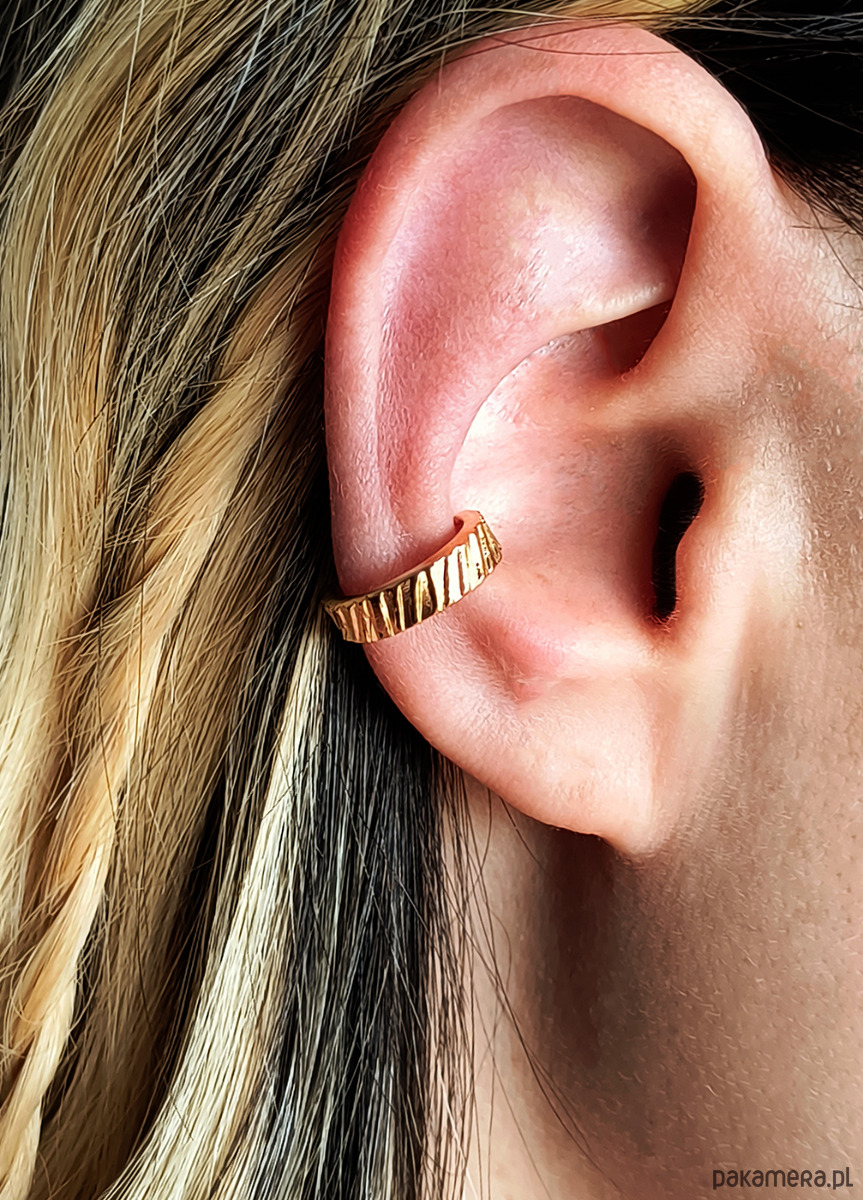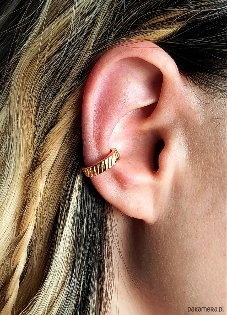 Nausznicę wykonałam własnoręcznie ze srebra próby 925 i pozłociłam. Powierzchnia jest ozdobiona prążkowaną fakturą, dzięki czemu pięknie załamuje światło.
