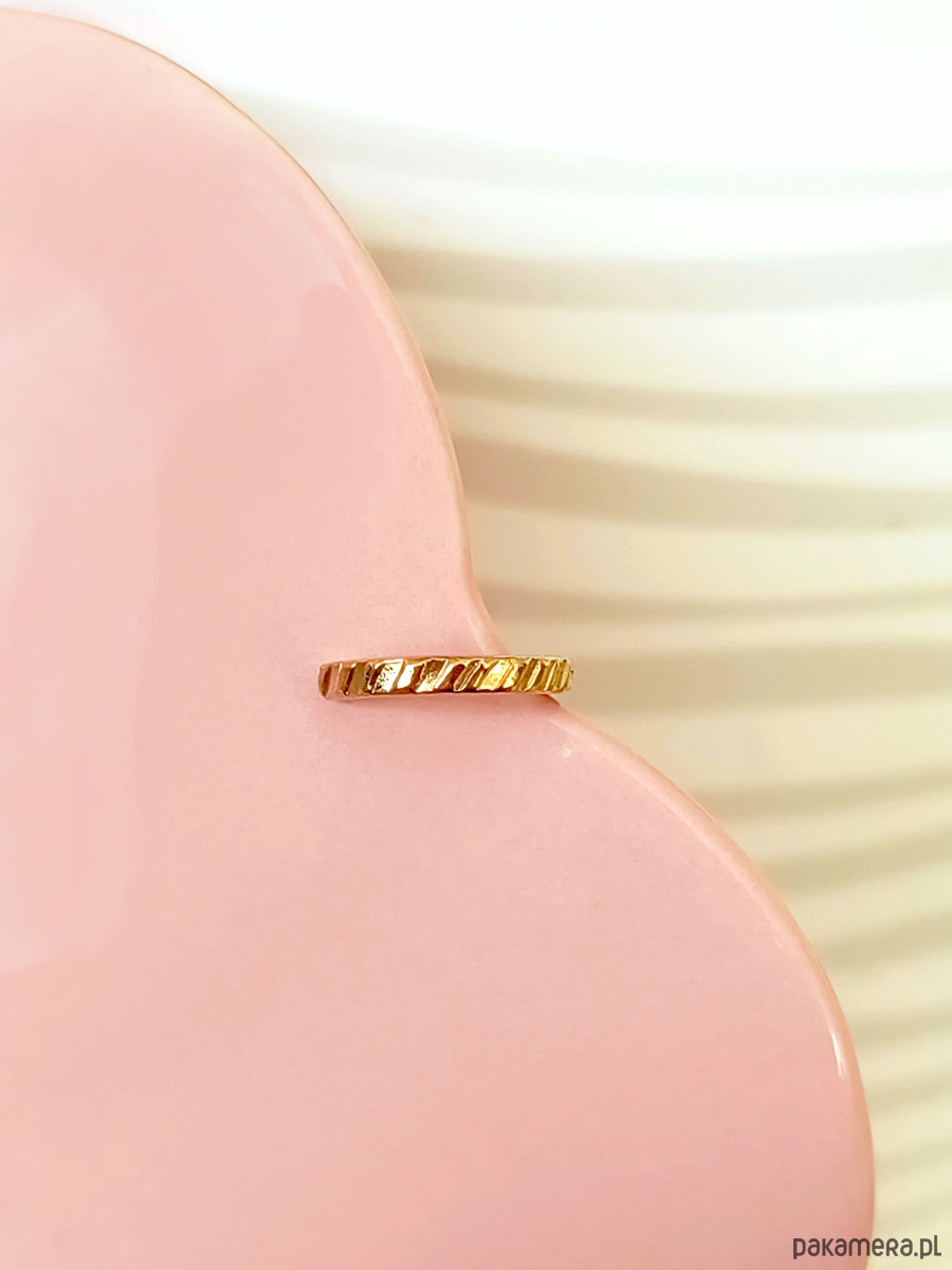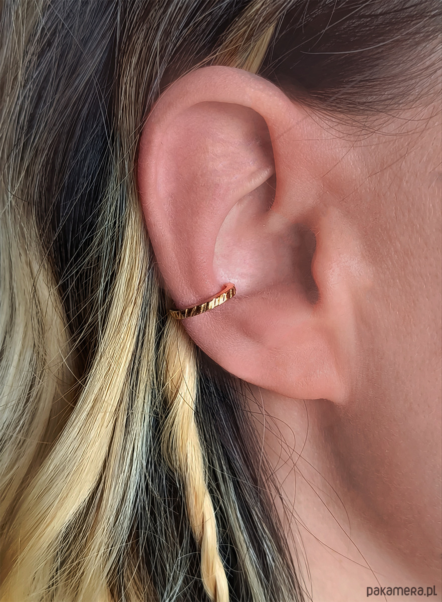 Nausznicę wykonałam własnoręcznie ze srebra próby 925 i pozłociłam. Powierzchnia jest ozdobiona prążkowaną fakturą, dzięki czemu pięknie załamuje światło.