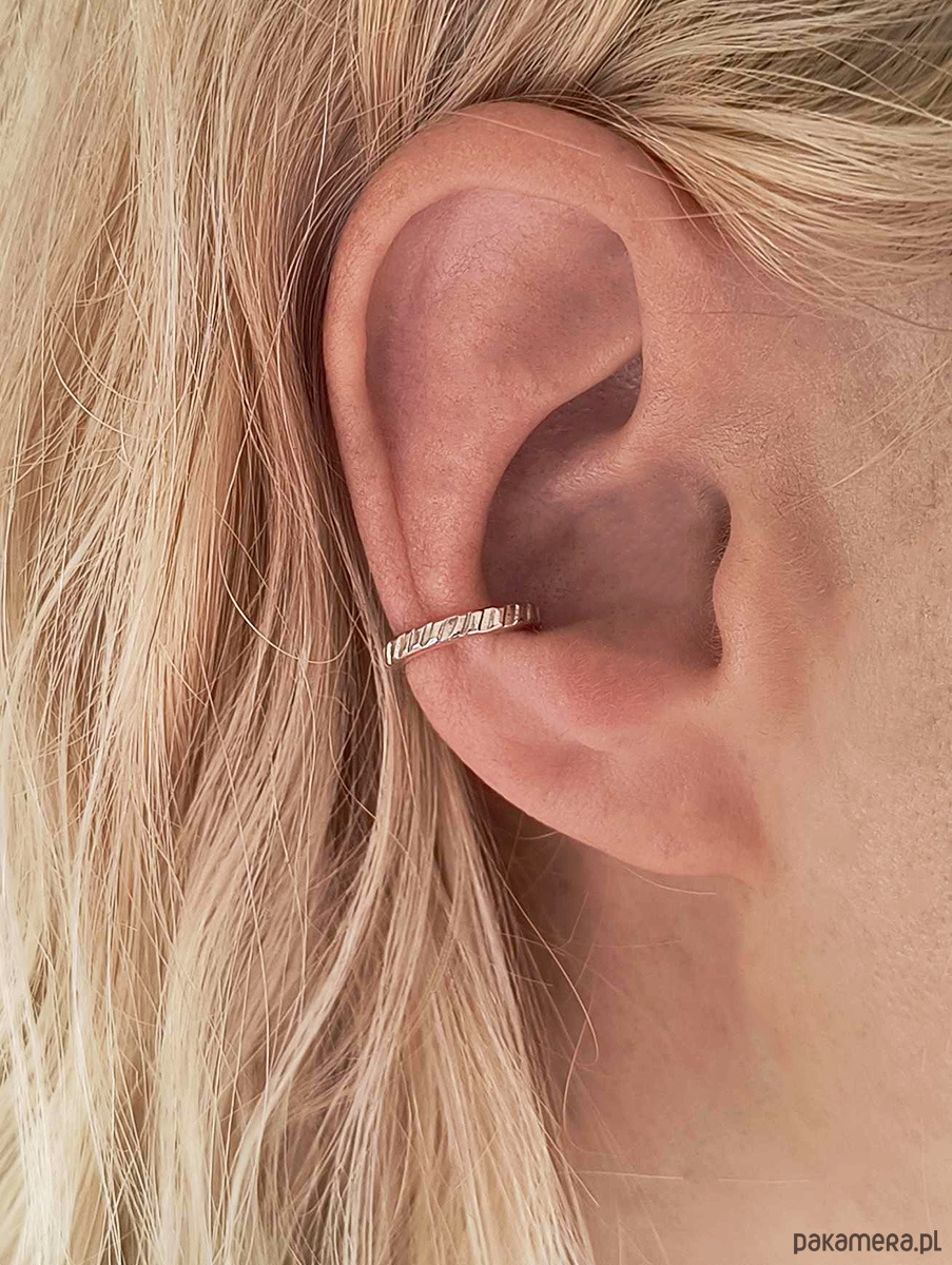 Nausznicę wykonałam własnoręcznie ze srebra próby 925. Powierzchnia jest ozdobiona prążkowaną fakturą, dzięki czemu pięknie załamuje światło.