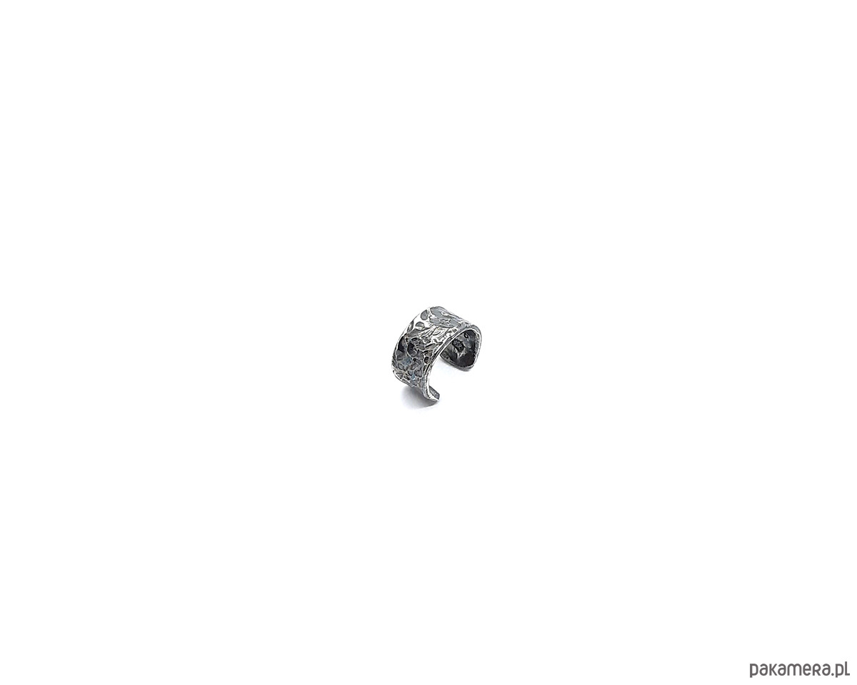 Nausznicę wykonałam własnoręcznie ze srebra próby 925. Powierzchnia jest ozdobiona fakturą, dzięki czemu pięknie załamuje światło, a oksyda nadaje ciemniejszy kolor srebra.