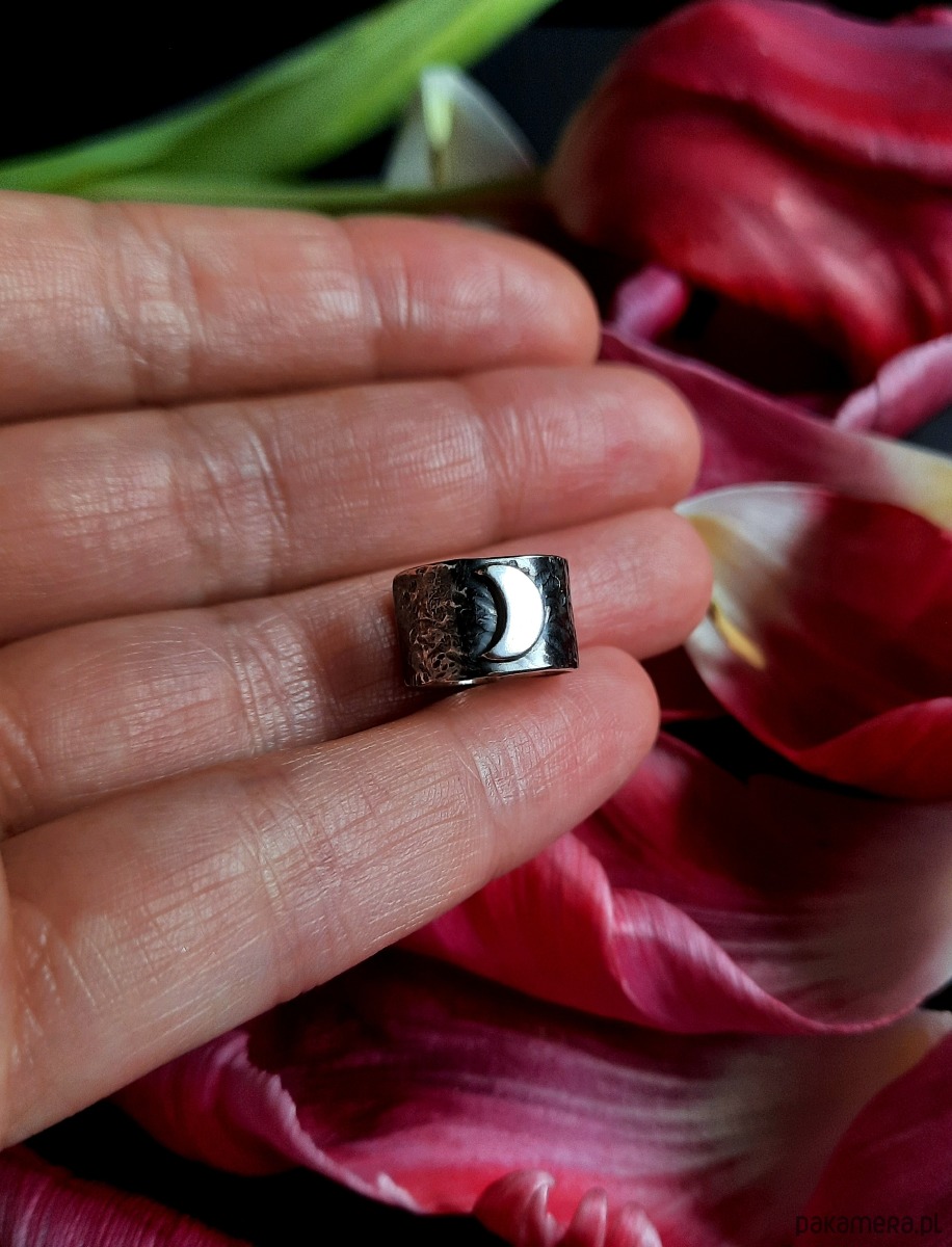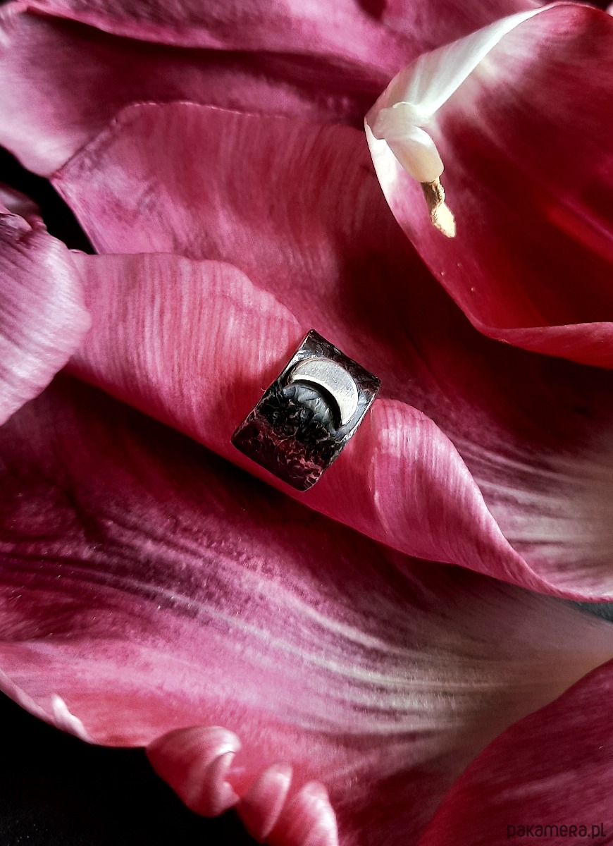 Nausznicę wykonałam własnoręcznie ze srebra próby 925. Powierzchnia jest ozdobiona fakturą, dzięki czemu pięknie załamuje światło, a oksydowane zagłębienia nadają wyrazistości.