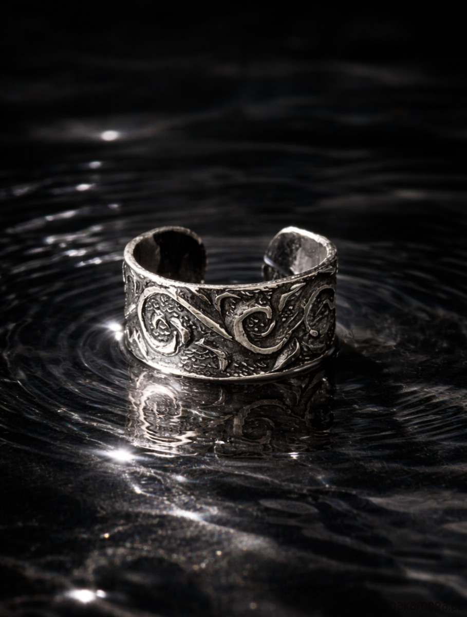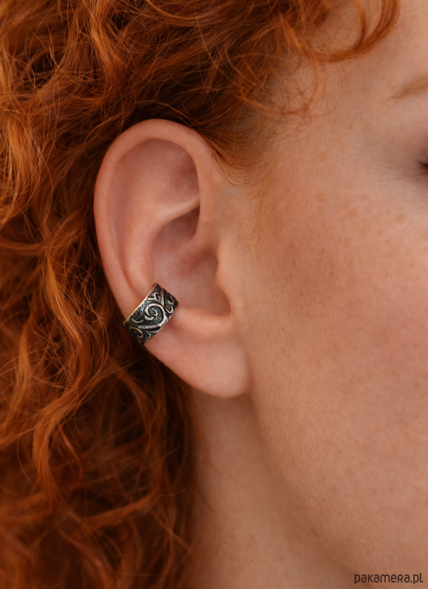 Nausznicę wykonałam własnoręcznie ze srebra próby 925. Powierzchnia jest ozdobiona fakturą, dzięki czemu pięknie załamuje światło, a oksydowane zagłębienia nadają wyrazistości.
