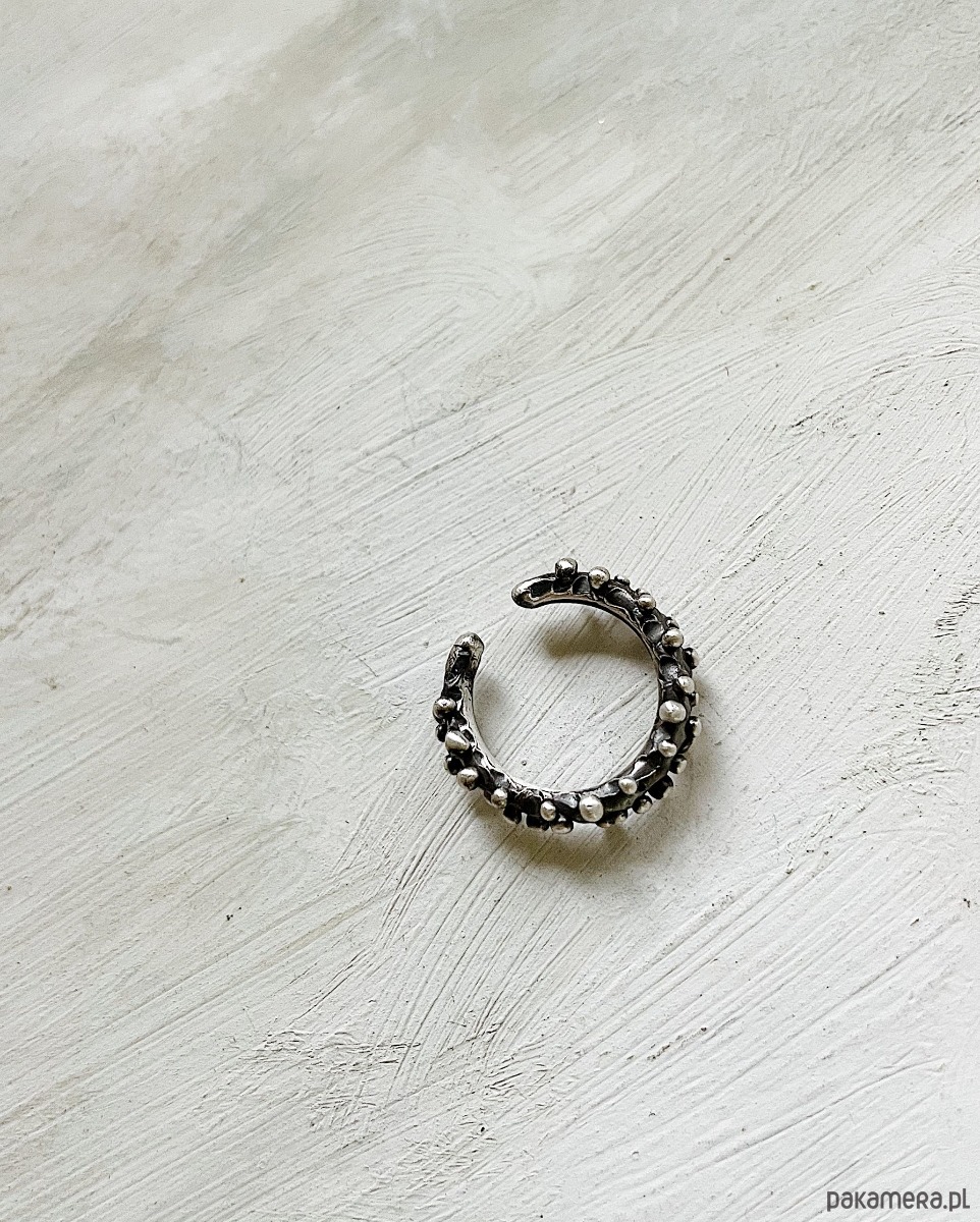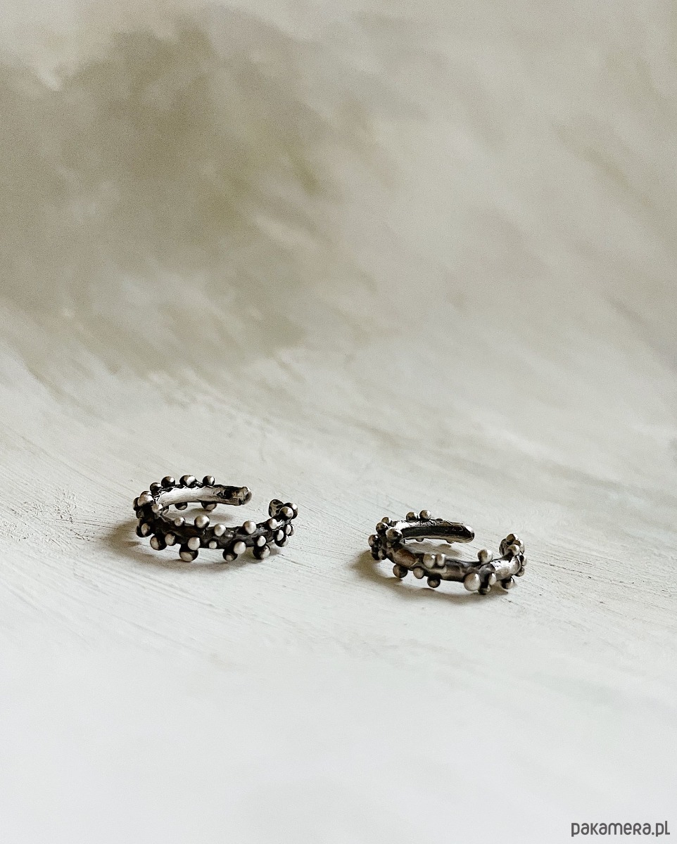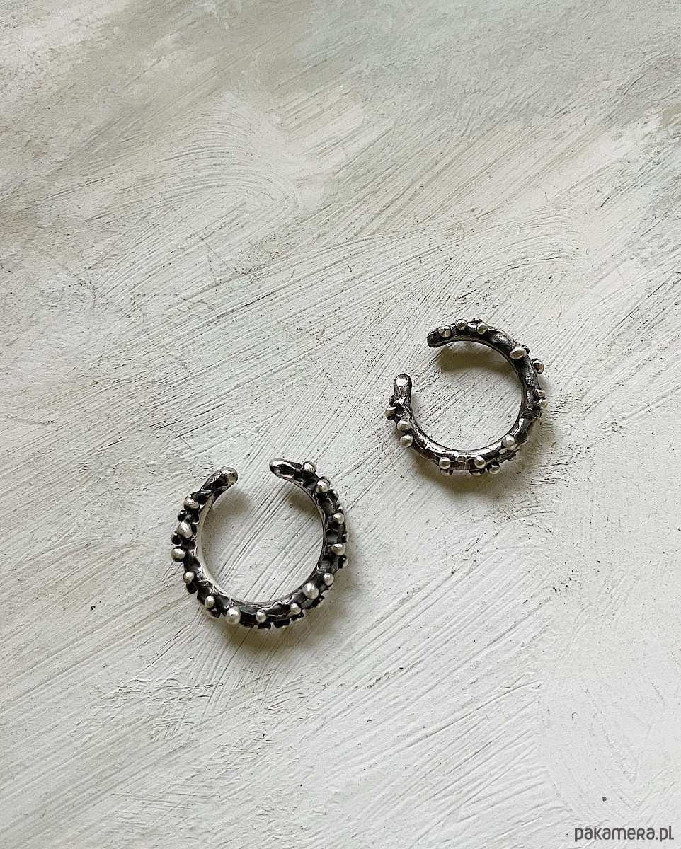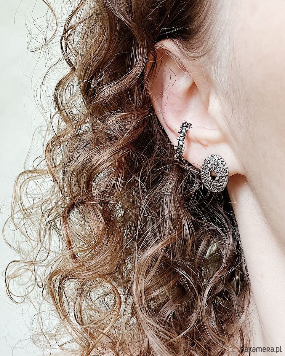 Nausznica ozdobiona organiczna, surową fakturą i srebrnymi kuleczkami.
