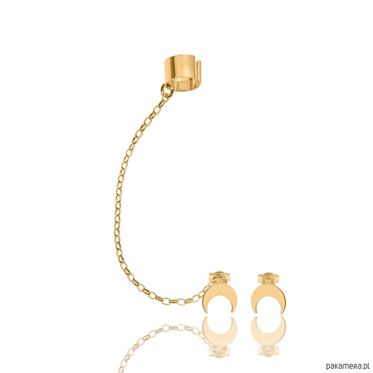 Nausznica srebrna pozłacana z łańcuszkiem i kolczykami księżycami. Nausznica nakładana na ucho. Kolczyki księżyce są zapinane na sztyft. Całość wykonana ze srebra 925 pokrytego 24 karatowym żółtym złotem.