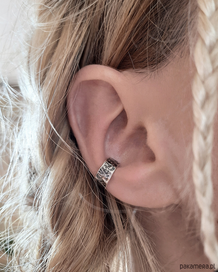 Nausznicę wykonałam własnoręcznie ze srebra próby 925. Powierzchnia jest ozdobiona fakturą, dzięki czemu pięknie załamuje światło, a oksydowane zagłębienia nadają wyrazistości.