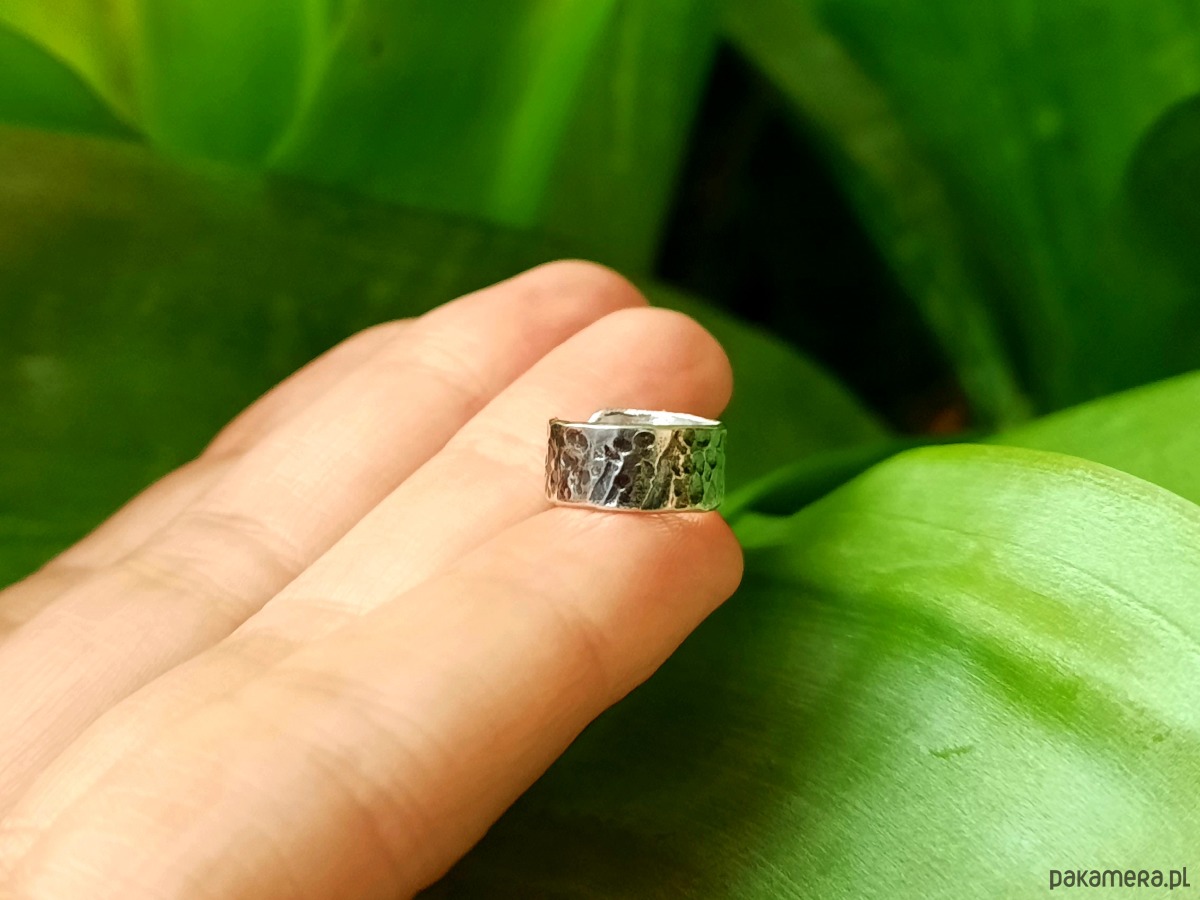 Nausznicę wykonałam własnoręcznie ze srebra próby 925. Powierzchnia jest ozdobiona fakturą, dzięki czemu pięknie załamuje światło, a oksydowane zagłębienia nadają wyrazistości.
