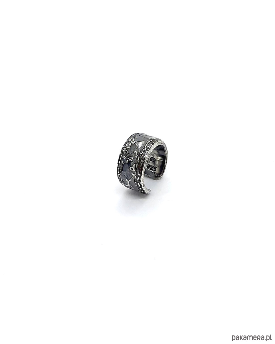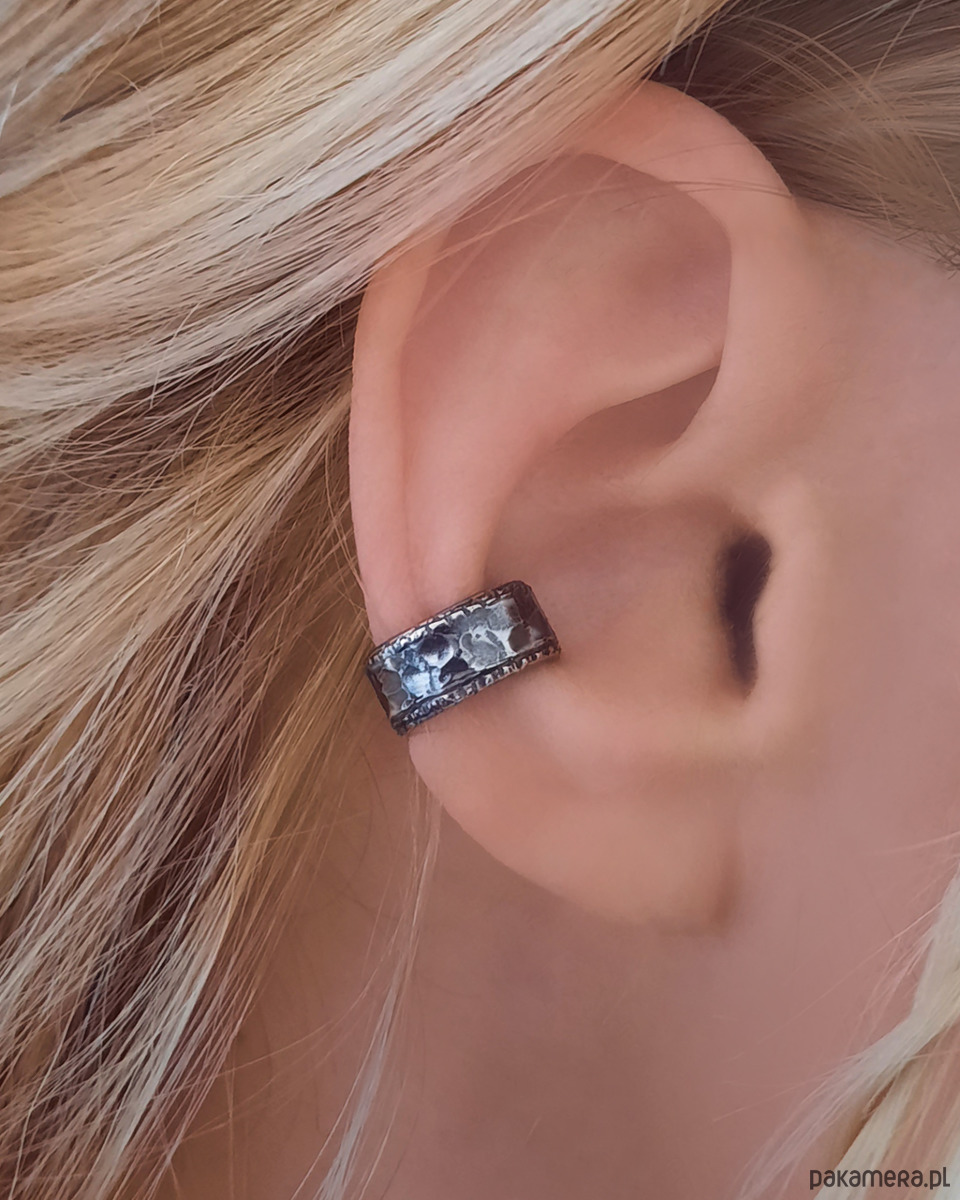 Nausznicę wykonałam własnoręcznie ze srebra próby 925. Powierzchnia jest ozdobiona fakturą, dzięki czemu pięknie załamuje światło, a oksydowane zagłębienia nadają wyrazistości.