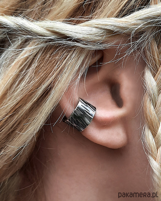 Nausznicę wykonałam własnoręcznie ze srebra próby 925. Powierzchnia jest ozdobiona fakturą, dzięki czemu pięknie załamuje światło, a oksydowane zagłębienia nadają wyrazistości.