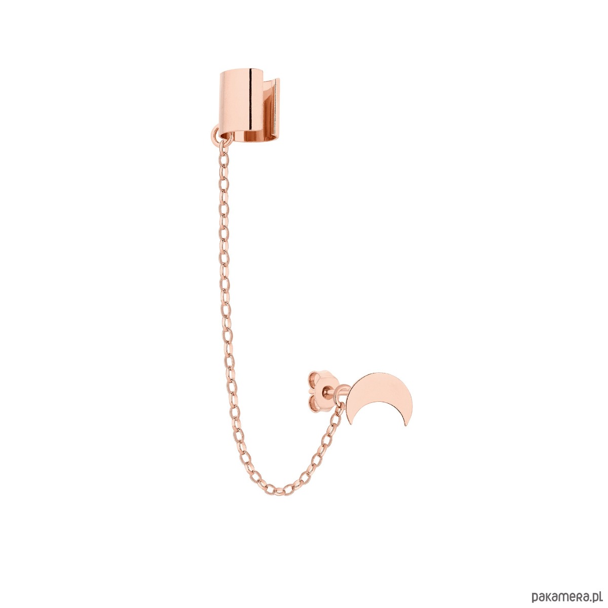 Złota gruba nausznica z łańcuszkiem i półksiężycem w całości wykonana ze srebra 925 powlekanego 18 karatowym różowym złotem.