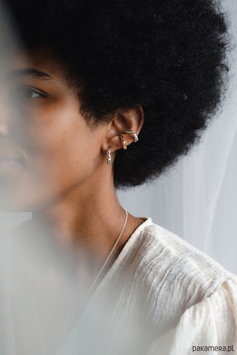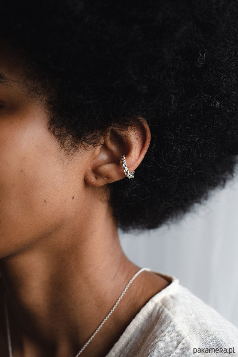 Nausznica o nieregularnym kształcie i fakturze. Noszona na środkowej części małżowiny usznej.