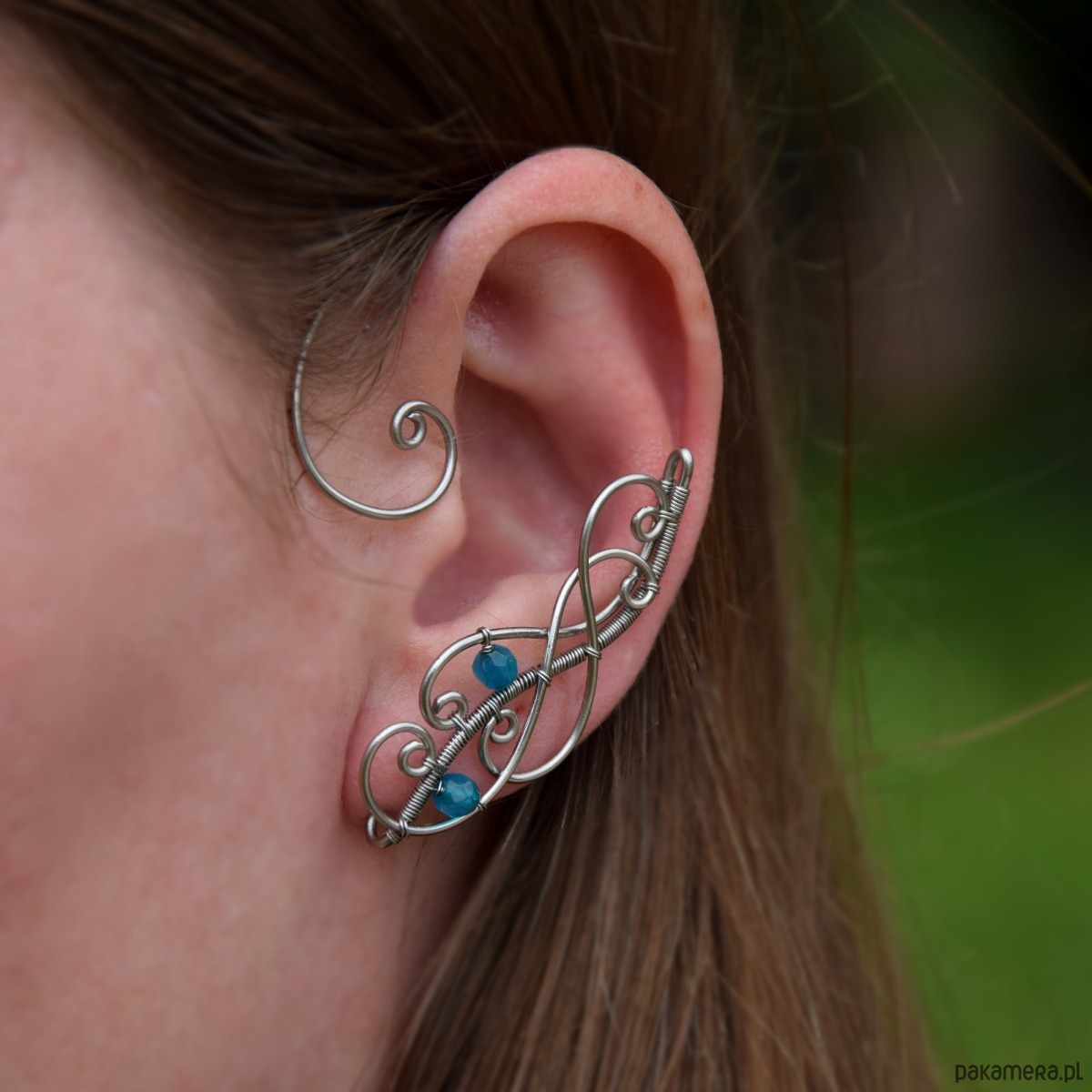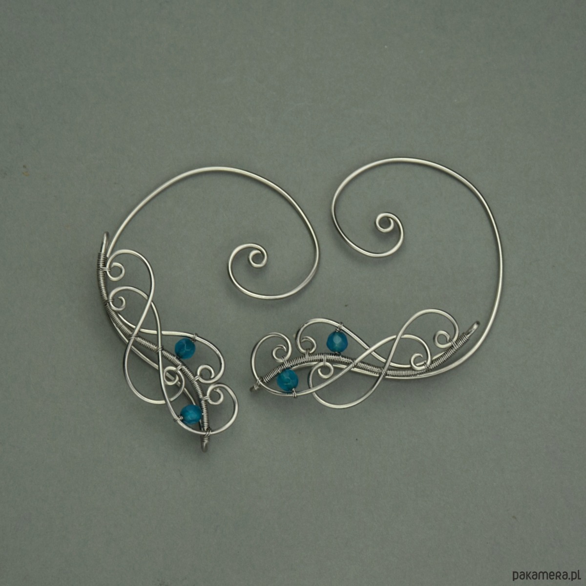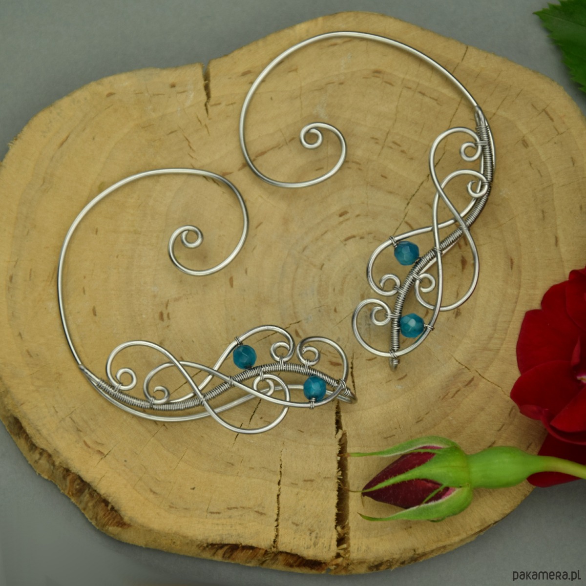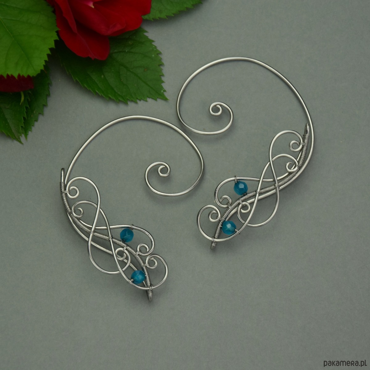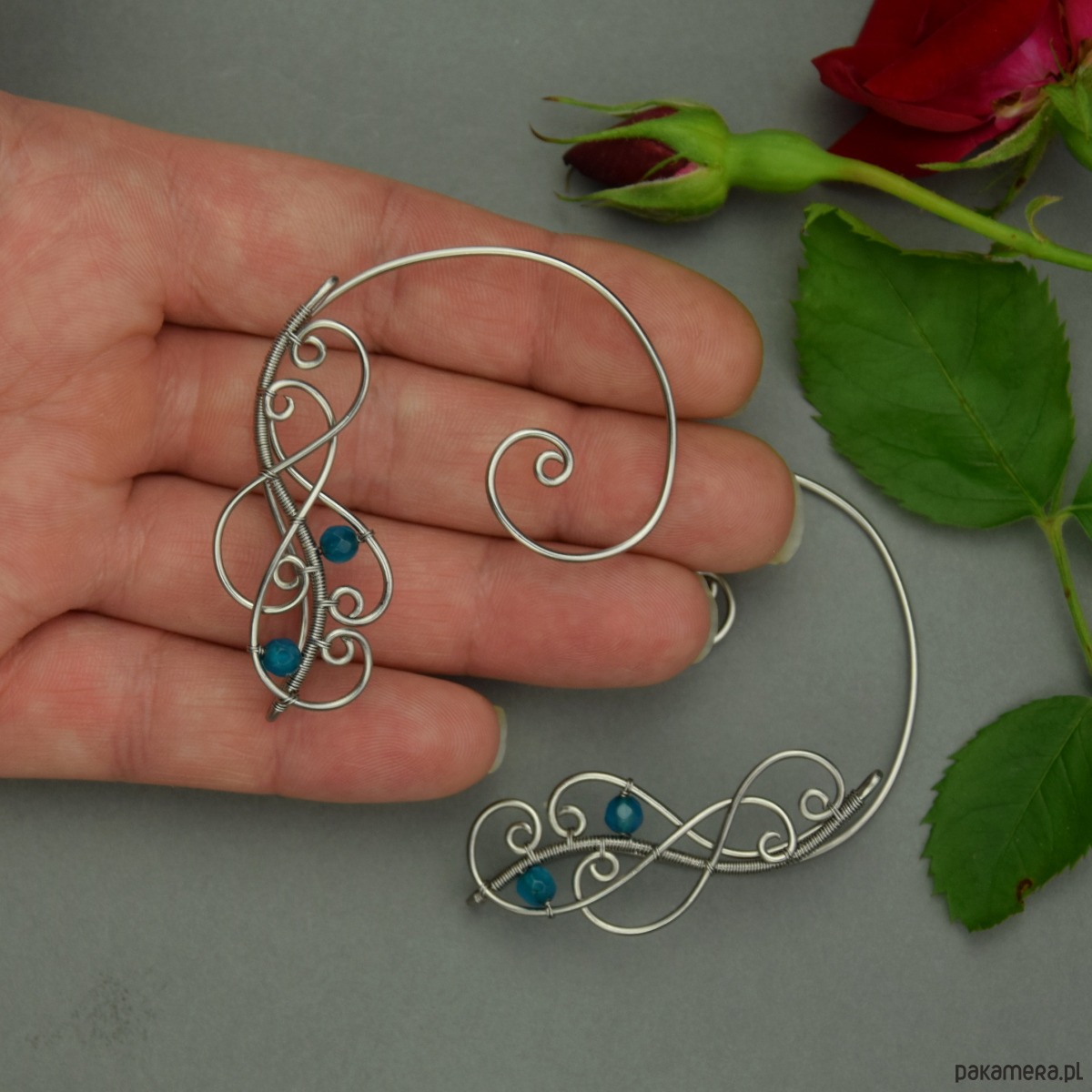 Para oryginalnych, ażurowych, ręcznie zrobionych nausznic (a właściwie zausznic) z niebieskimi kwarcami. Zrobione techniką wire wrapping, w całości z drutów ze stali chirurgicznej.