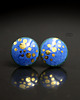 Ceramiczne okrągłe kolczyki, ręcznie wykonane z delikatnej błękitnej porcelany, jednostronnie szkliwione błękitnym błyszczącym szkliwem z efektem plamek, punktowo dekorowane złotem naszkliwnym, na antyalergicznych sztyftach ze stali chirurgicznej w kolorze srebrnym. Średnica ok. 9mm. Polecam