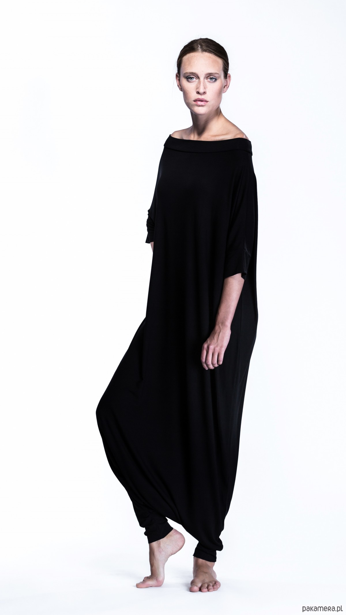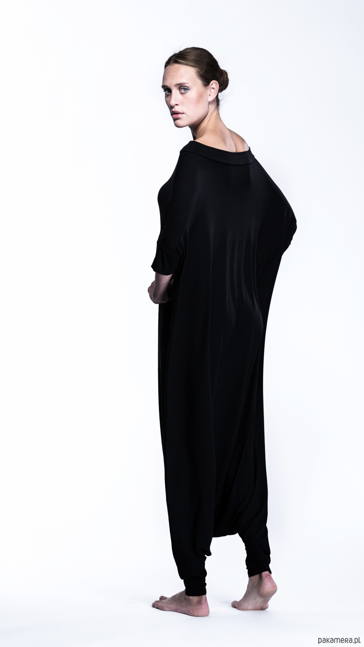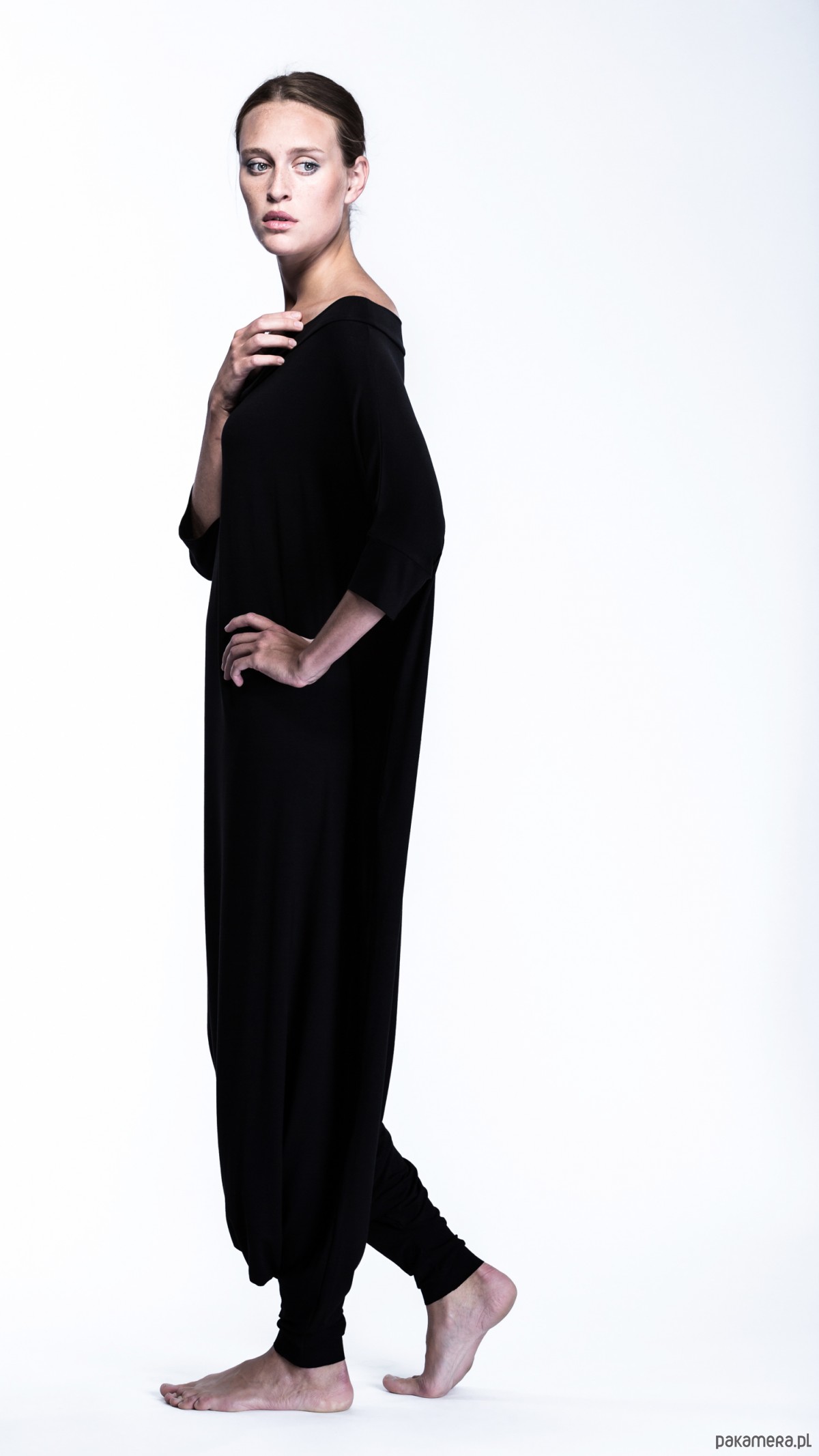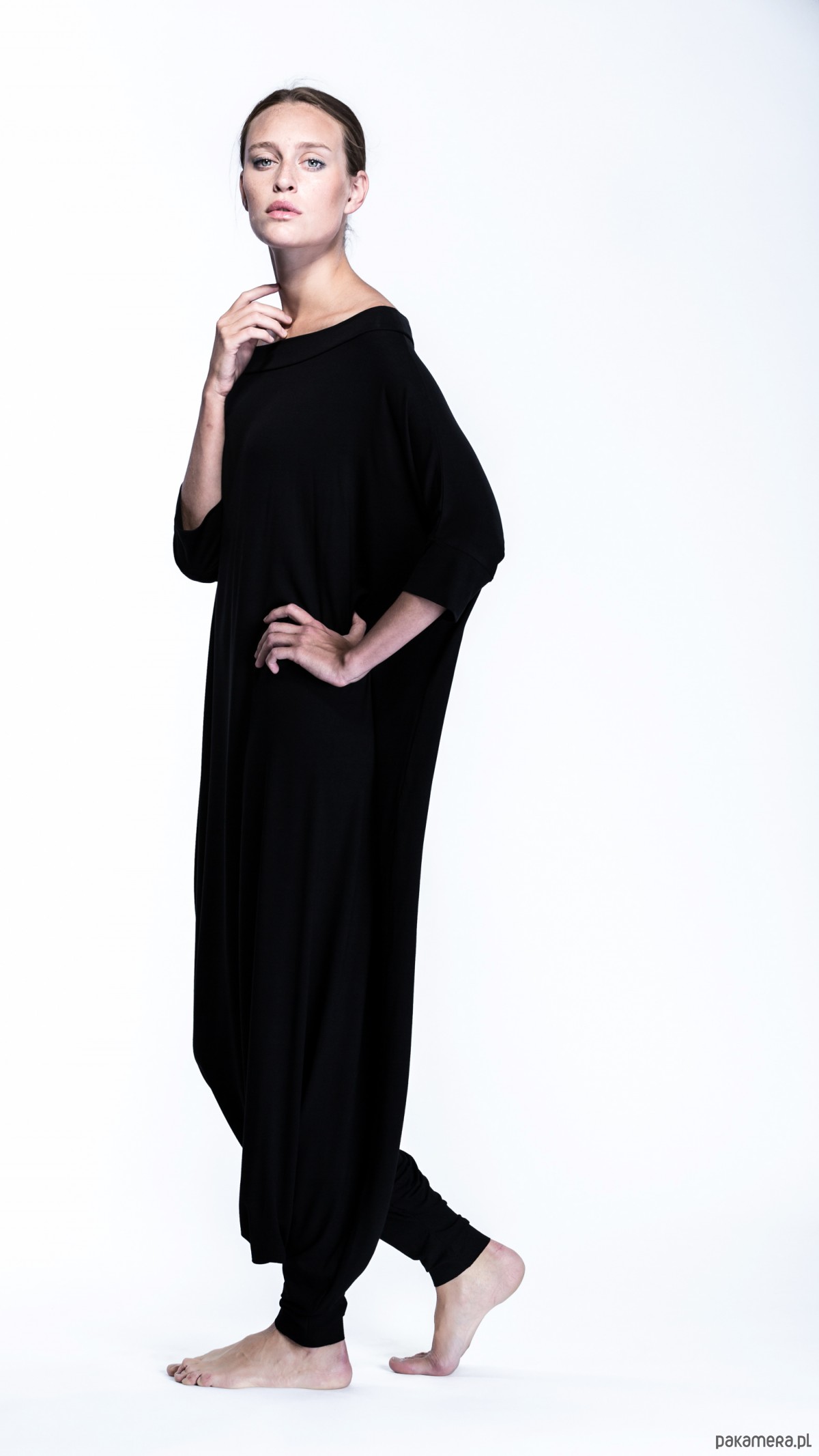 Komfortowy, stylowy kombinezon w klimacie saruel uszyty z lejącej dzianiny (wiskoza, elastan),