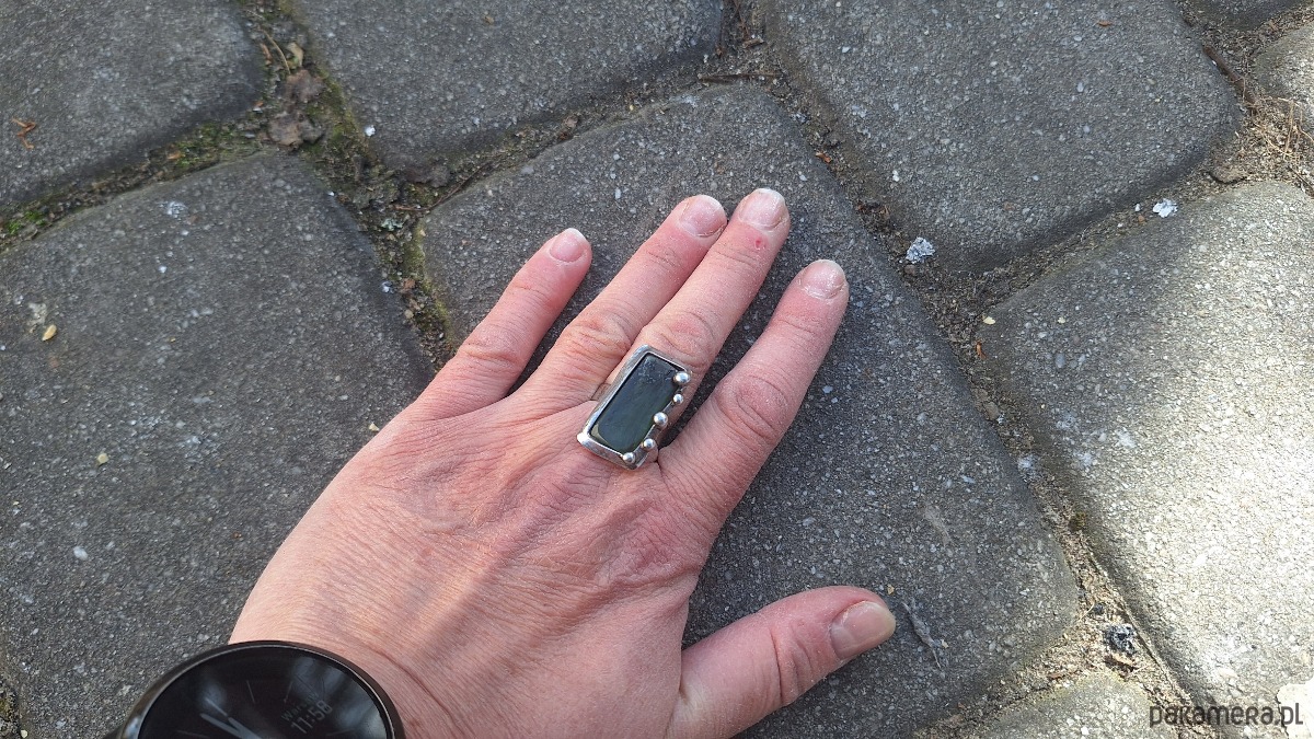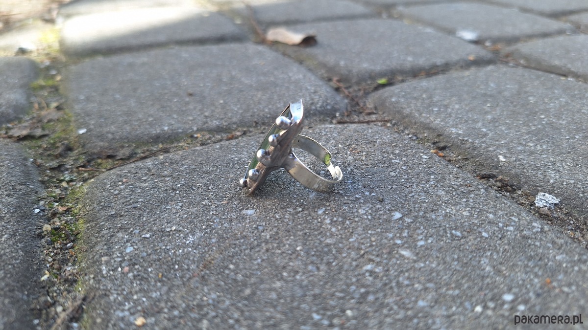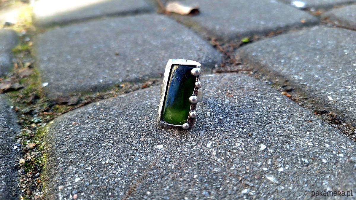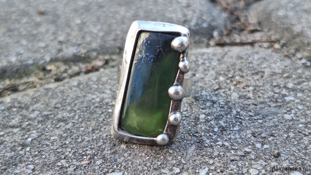 Pierścionek wykonany z miedzi, cyny i nefrytu. Wymiary ok. 2.6 na 1.5 cm. Regulowany. Nie jest ciężki.
