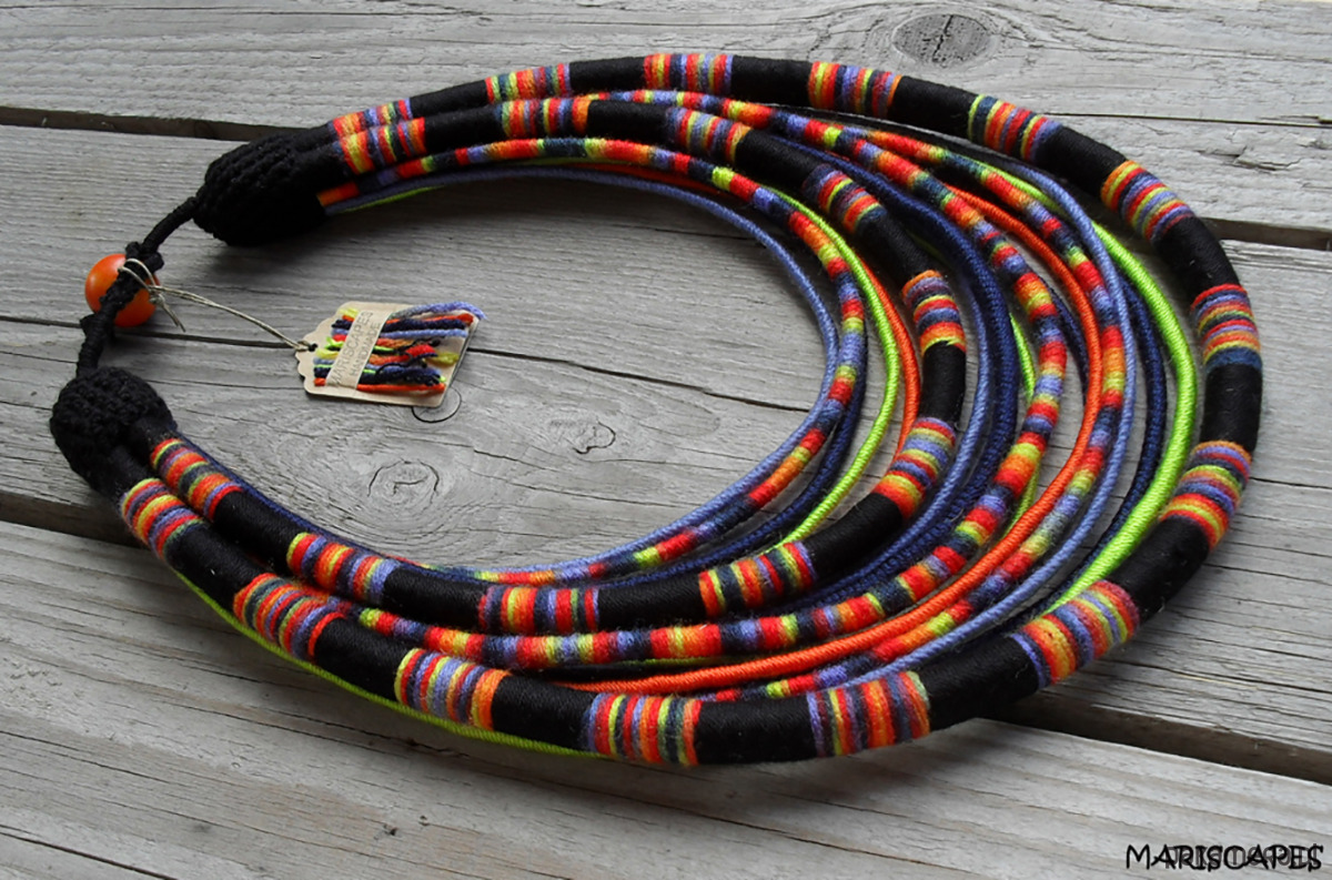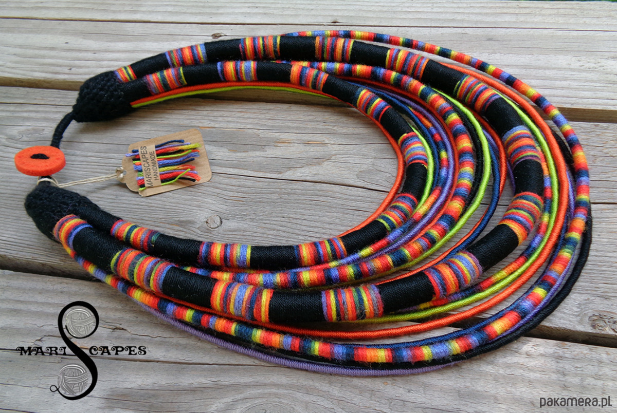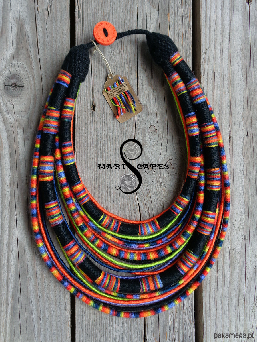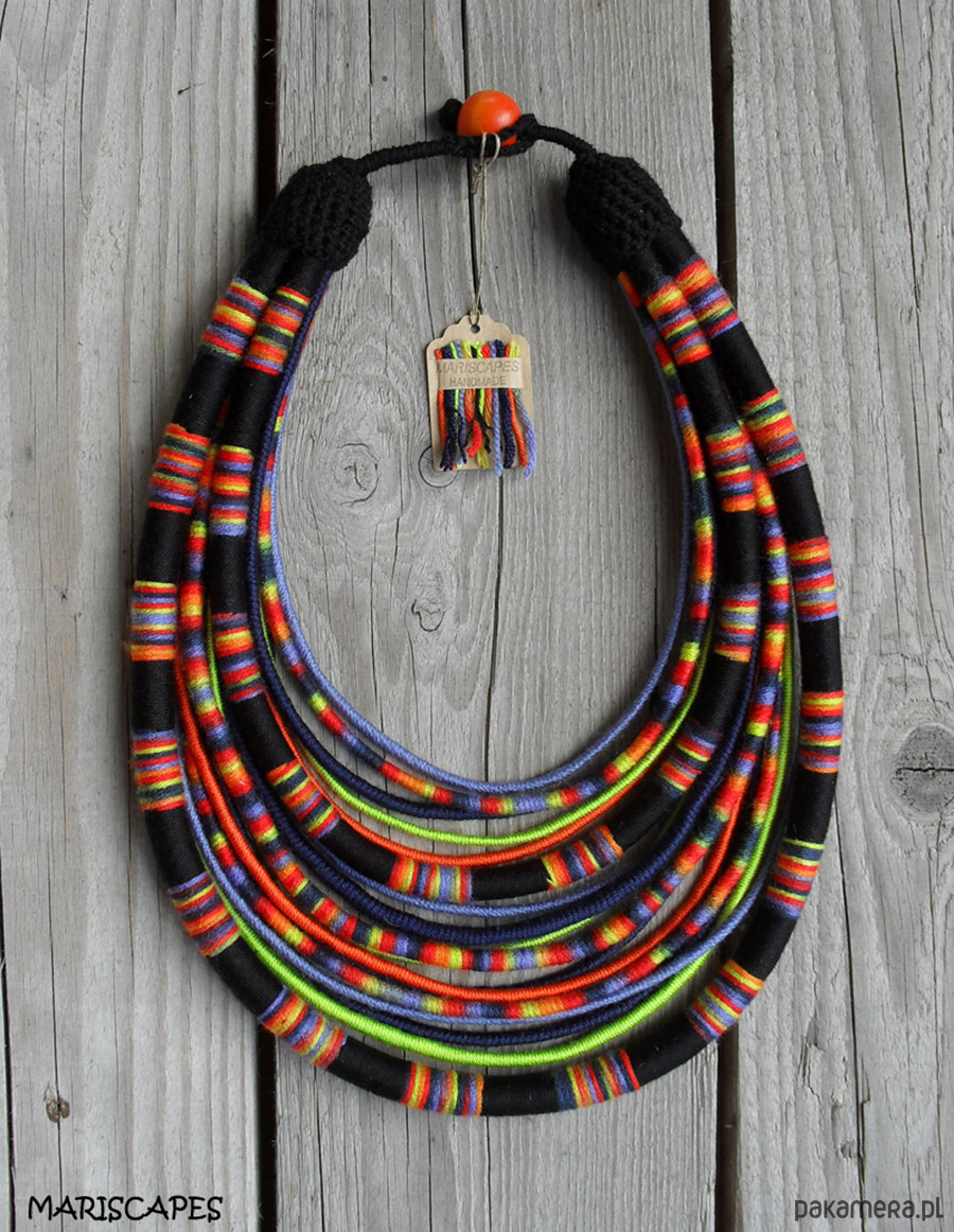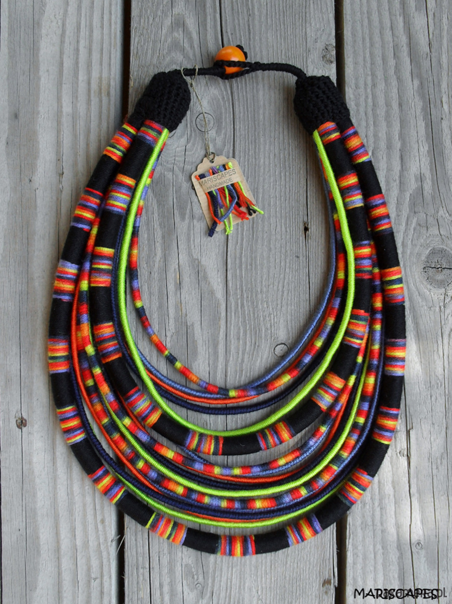 Unikalny naszyjnik w stylu etnicznym / afrykańskim z wymyślonej przeze mnie autorskiej serii włóczkowych "Masajek". Długość ok. 45-70 cm Stworzony z połączenia wielu długich, nieco sztywnych sznurków, pieczołowicie ręcznie owiniętych przyjemnymi w dotyku włóczkami (akryl, mikrofibra z efektem jedwabiu) w soczystym połączeniu limonki, pomarańczu i innych.