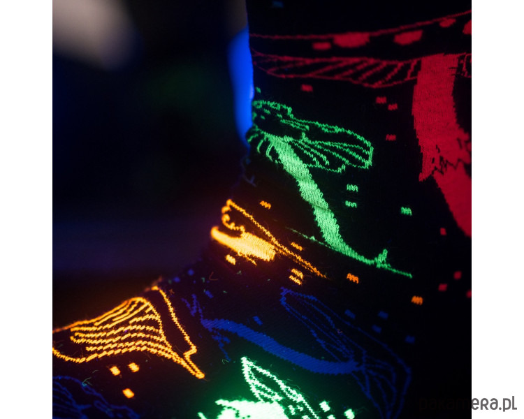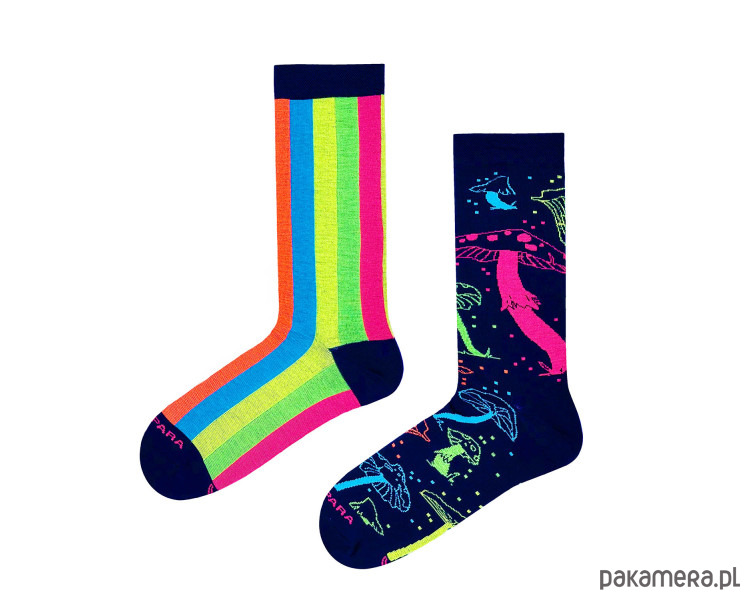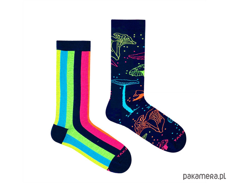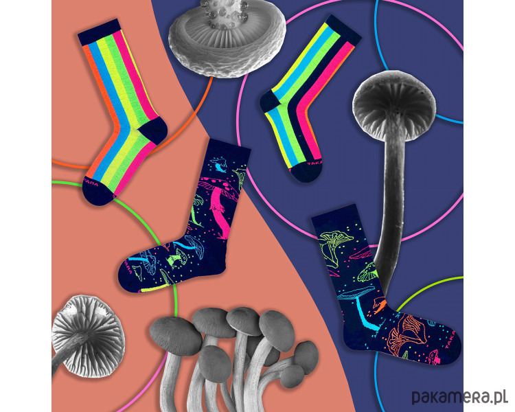 Daj się porwać magii neonowych kolorów z naszymi najnowszymi skarpetkami nie do pary od Takapara. Pierwsza skarpetka, w głębokim odcieniu granatu, prezentuje serię świecących grzybków w kolorach psychodelicznych. Neonowe odcienie różu, zielonego i żółtego sprawiają, że każdy krok nabiera charakteru. Druga skarpetka zaprasza do świata neonowych pasów, które nawiązują do efektów wizualnych, jakie można zobaczyć po grzybkach psylo. Te wzory to nie tylko estetyka, ale też odzwierciedlenie kultury i odrobina humoru. A czy wiedzieliście, że grzybki psylo są używane w badaniach nad leczeniem depresji i lęku? Oczywiście, nasze skarpetki nie mają takich właściwości, ale na pewno dodadzą koloru do Twojego dnia!