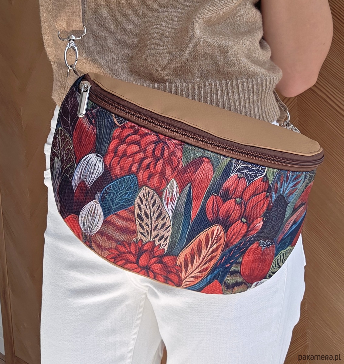 Nerka, saszetka do noszenia na ramię z regulowanym paskiem, zapinana na suwak, w środku mała kieszonka na suwak.