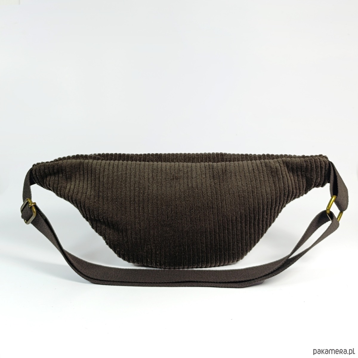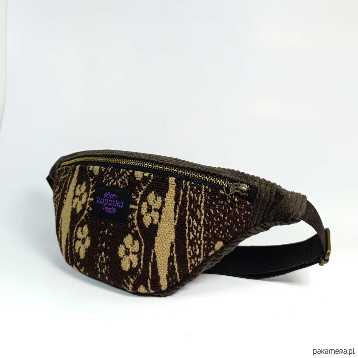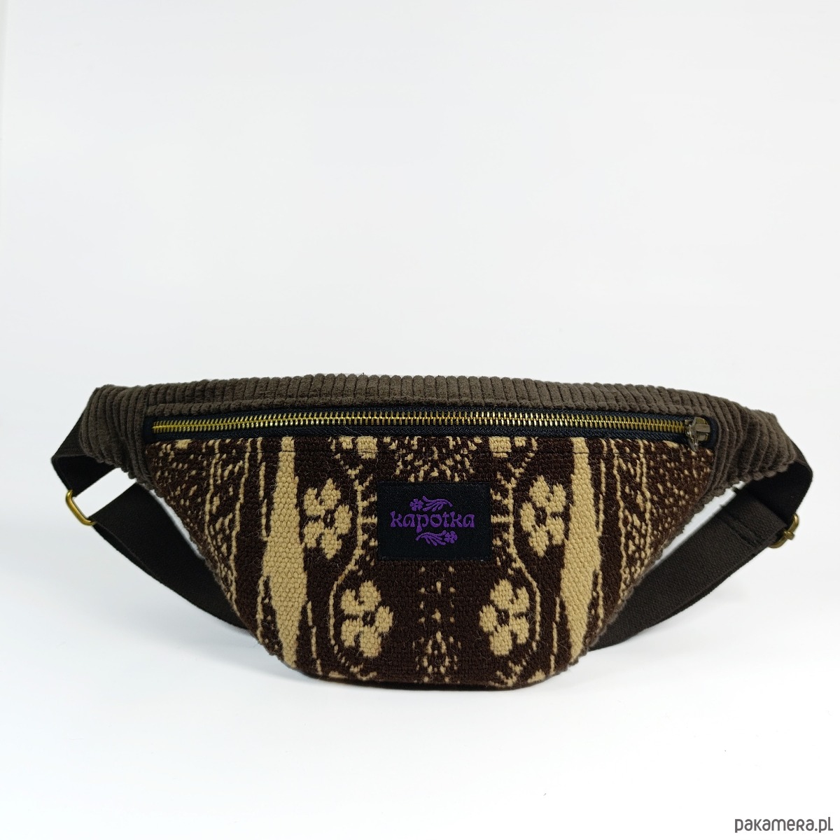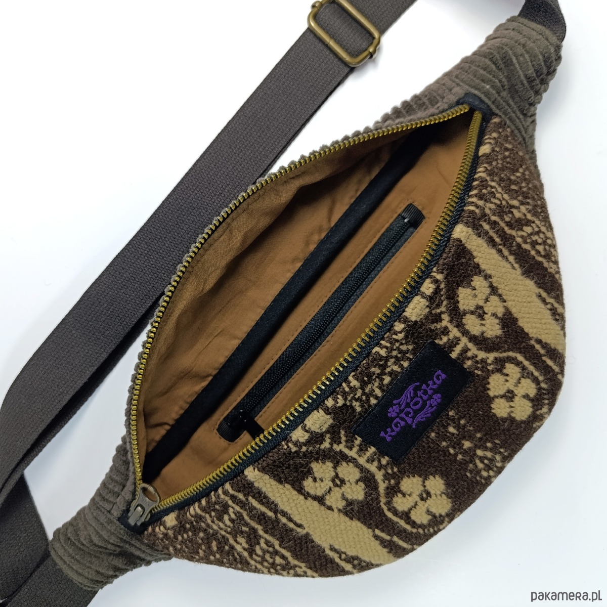 Upcyclingowa nerka z regulowanym paskiem. Można nosić zarówno na ramieniu, jak i na biodrach. Przód uszyty jest z pięknej, wzorzystej tkaniny z okresu PRL-u, w kolorze żółto - brązowym. Tył z bawełnianego sztruksu w brązowym kolorze. Zapinana na porządny metalowy zamek firmy YKK. W środku dodatkowa kieszonka zapinana na suwak. Brązowy pasek, miękki i wytrzymały, z parcianej taśmy bawełnianej. W środku wykończone bawełniną podszewką. Elementy kaletnicze pochodzą od polskiego producenta, są metalowe i wysokiej jakości. w kolorze starego złota.