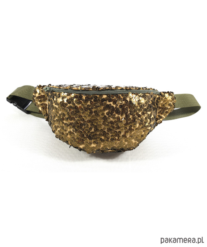 Jednokieszeniowa nerka w ciemnozłote cekiny. Na parcianym pasku w kolorze khaki.