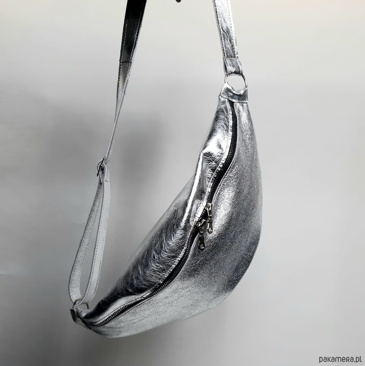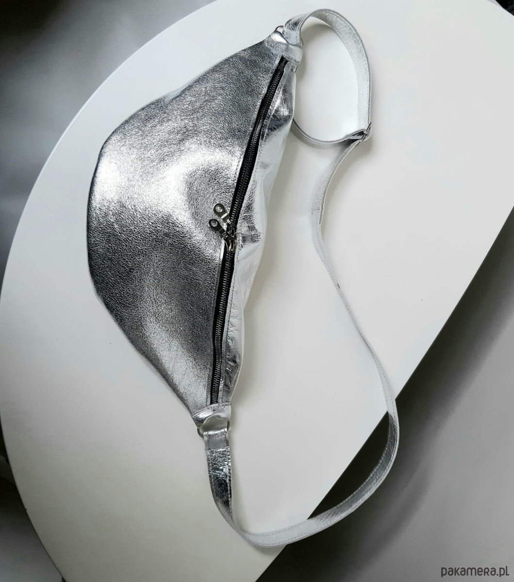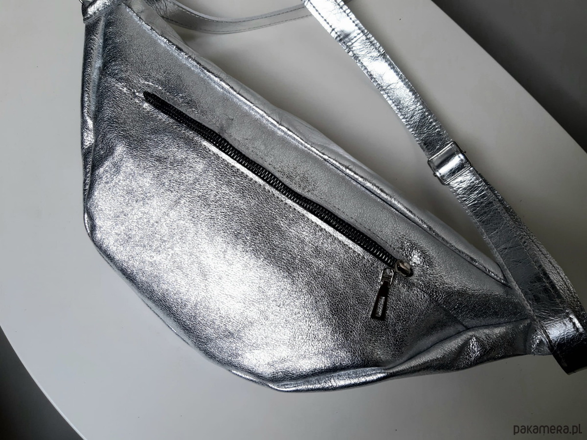 Duża skórzana nerka w kolorze srebrnym. Świetna na spacerki - idealna do przechowywania telefonu, kluczy i portfela.
