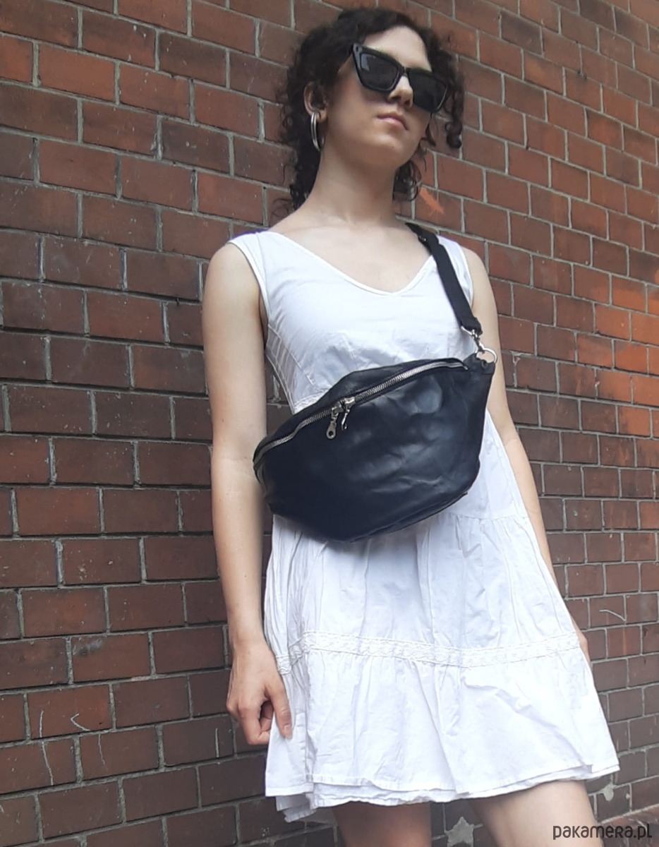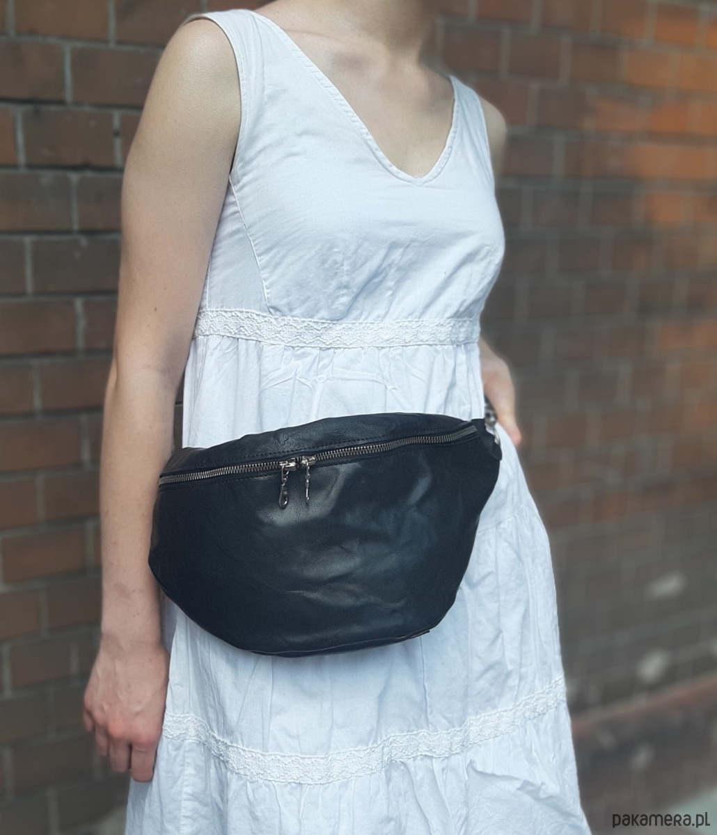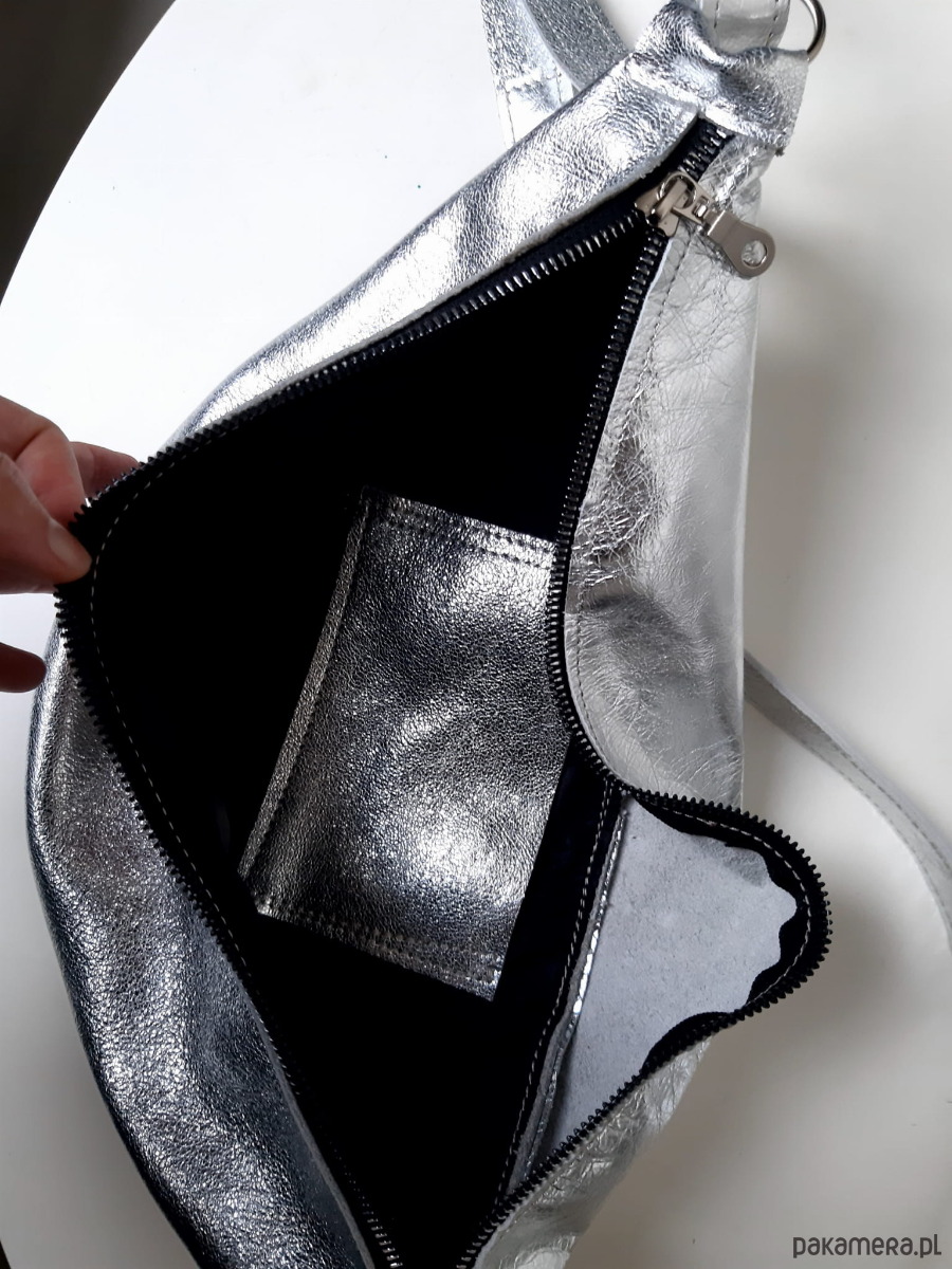 Duża skórzana nerka w kolorze srebrnym. Świetna na spacerki - idealna do przechowywania telefonu, kluczy i portfela.