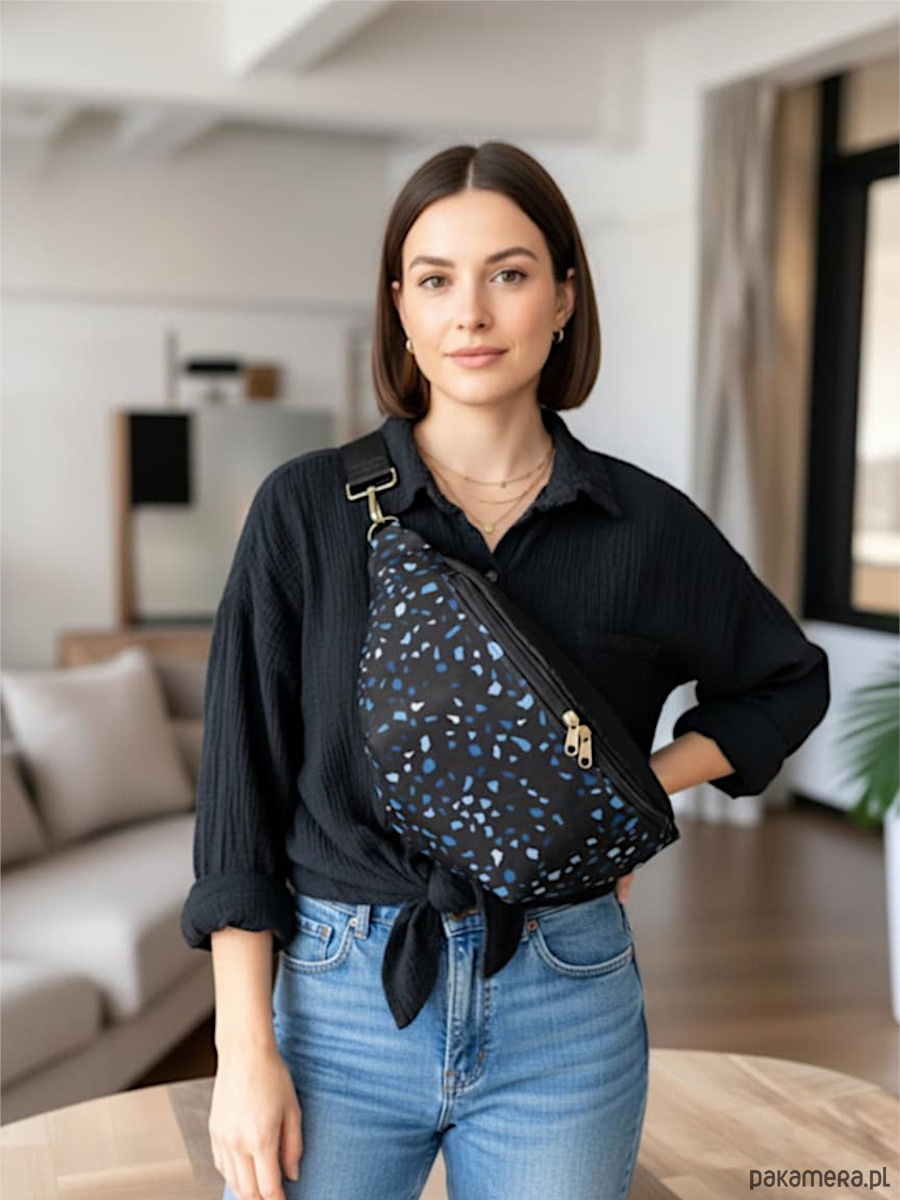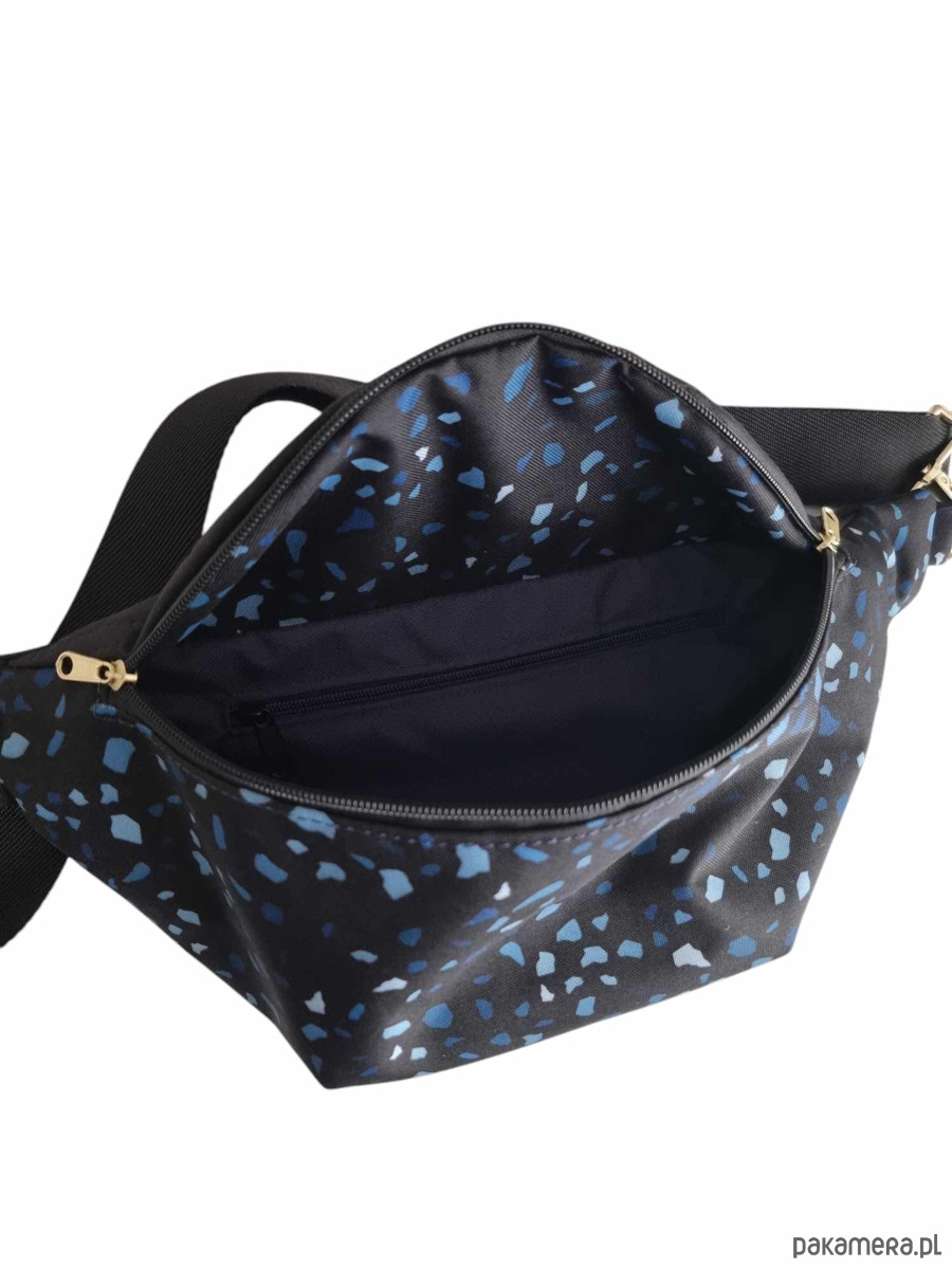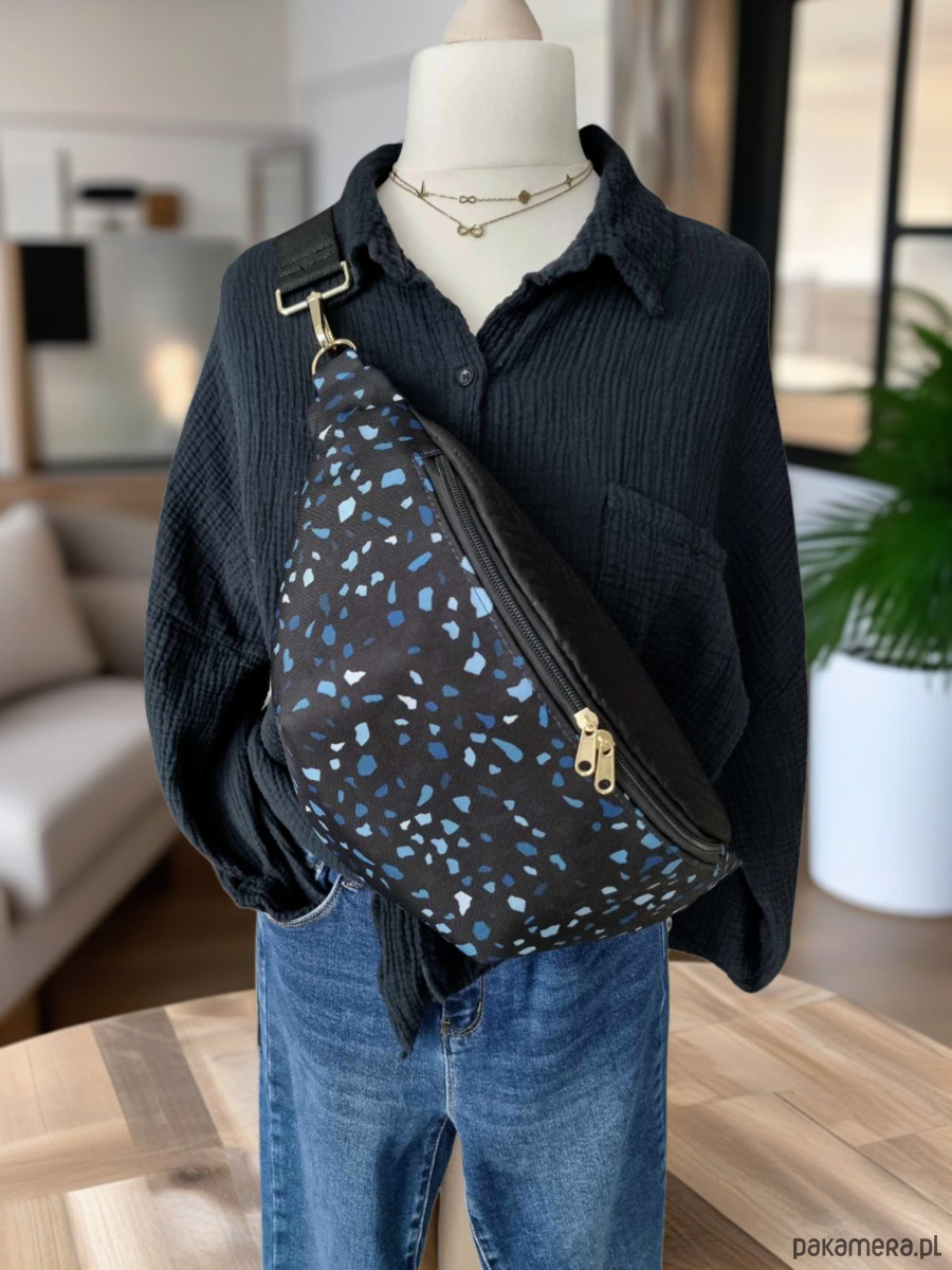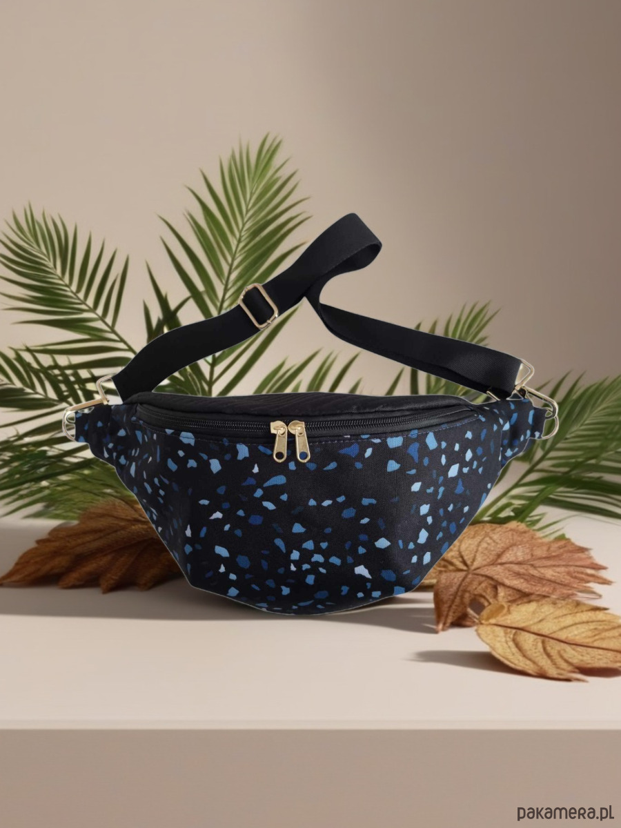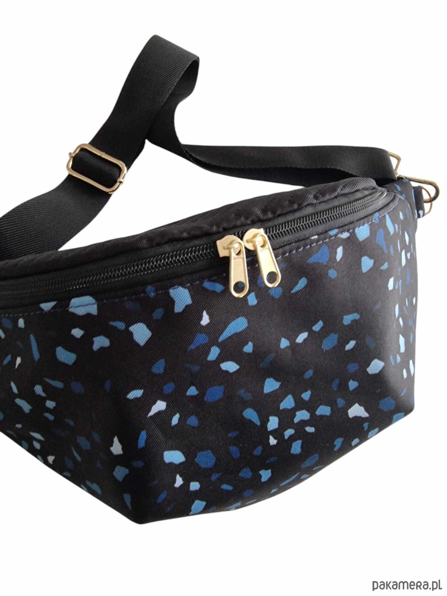 Duża nerka damska, wykonana z najwyższej jakości materiałów. Połączenie pikowanej tkaniny tapicerskiej w kolorze czarnym (góra i tył - wzór jodełka) z wodoodpornym przodem o abstrakcyjnym wzorze Lastryko.