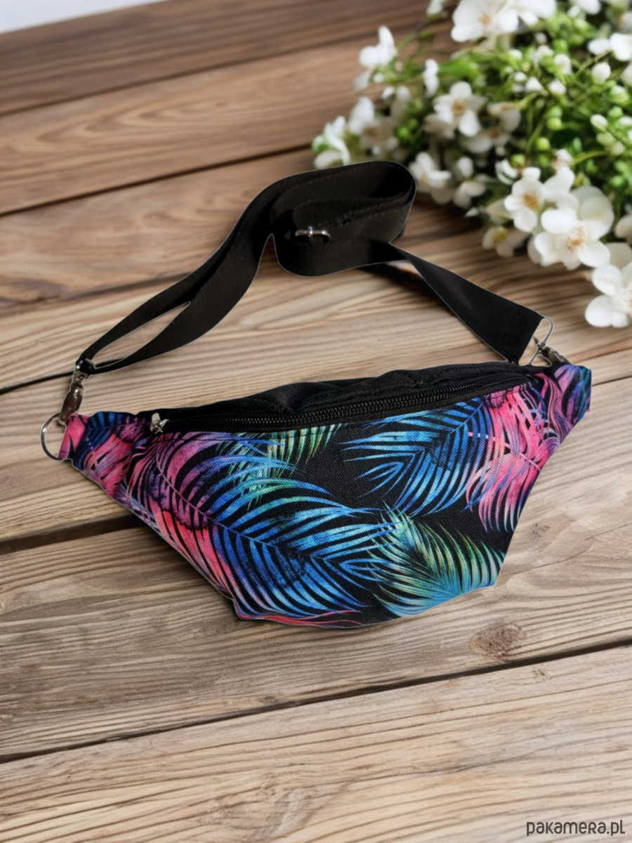 Damska nerka w rozmiarze L, wykonana z wodoodpornej tkaniny tapicerskiej. Tył i góra to czarna pikowana tkanina, przód zdobi motyw kolorowych liści.