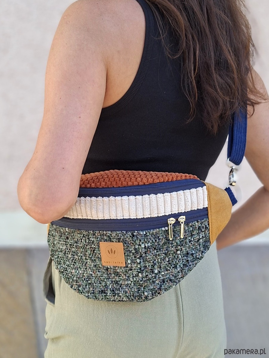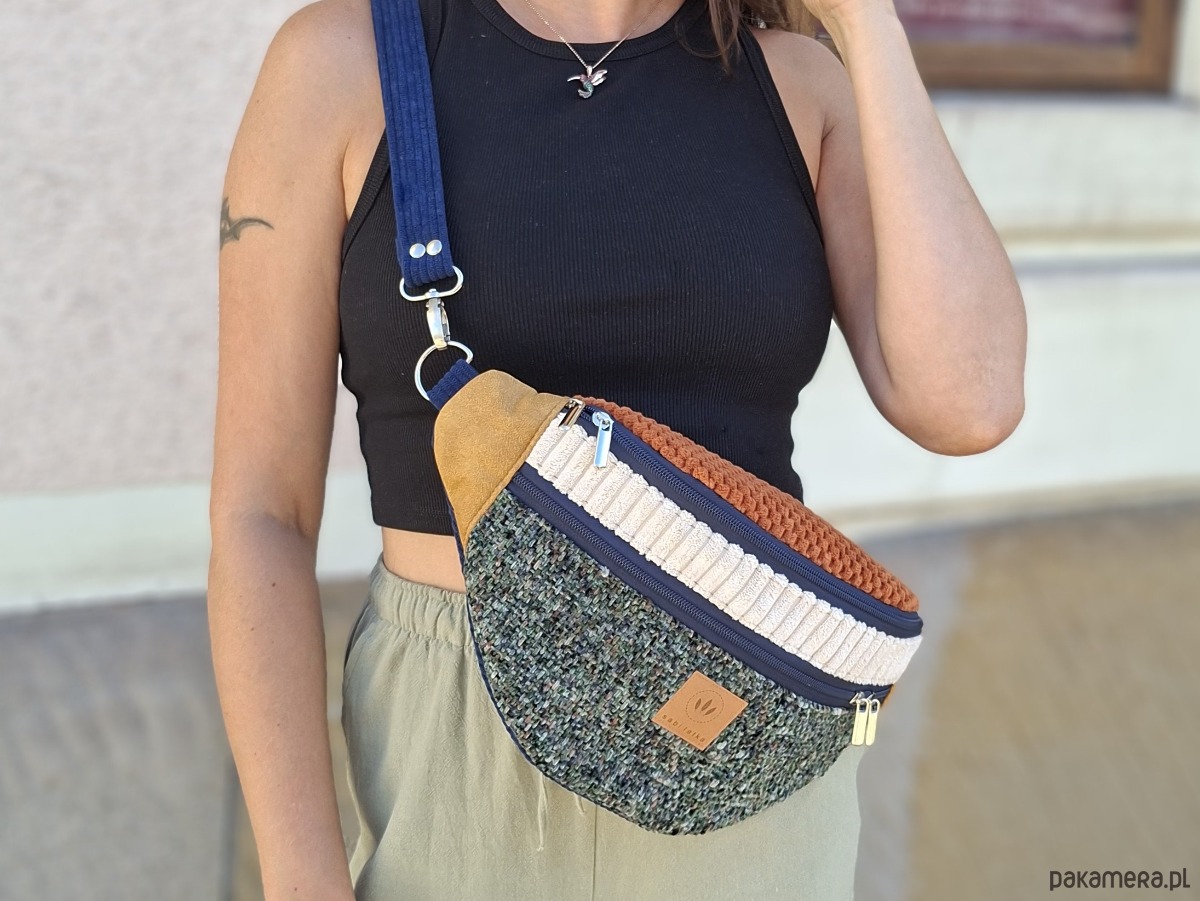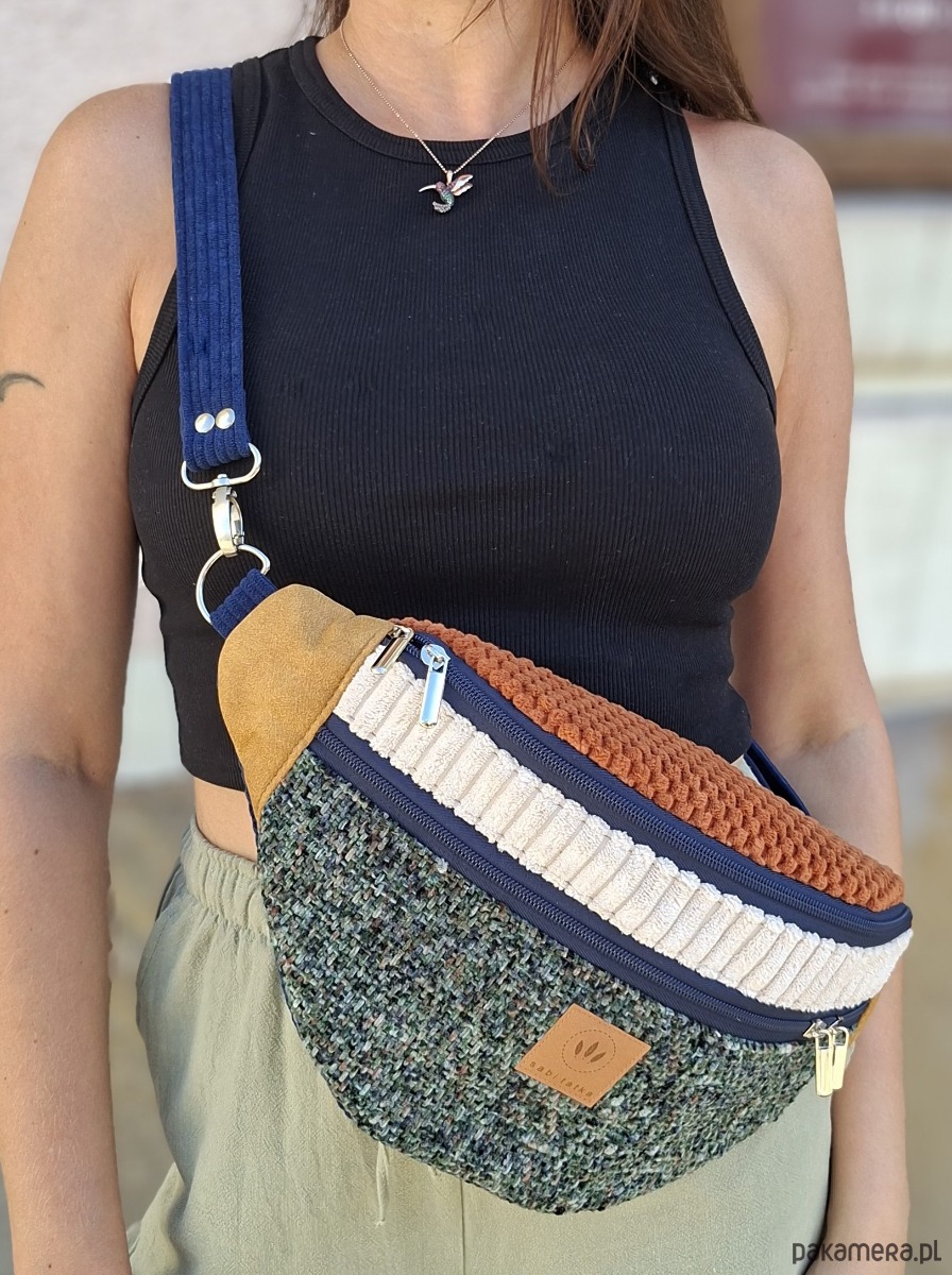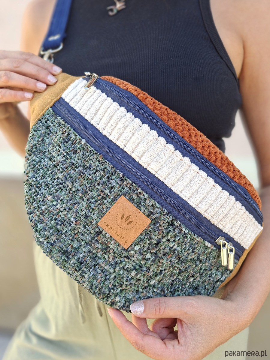 Bardzo duża nerka torebka damska z łączonych materiałów.