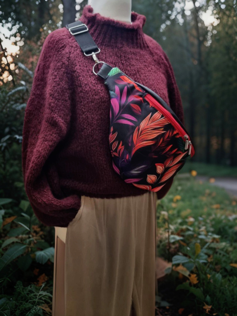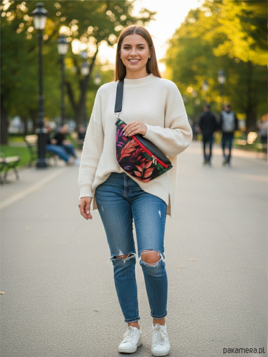 Duża, wygodna i z charakterem - taka właśnie jest ta nerka. Tył i góra uszyte zostały z czarnej ekoskóry, a przód to eksplozja barw na wodoodpornej tkaninie tapicerskiej. Połączenie klasyki z energią kolorów sprawia, że nerka pasuje zarówno do codziennych stylizacji, jak i na większe wyjścia.