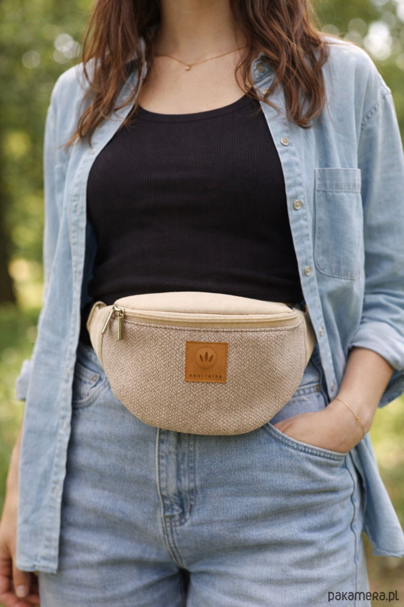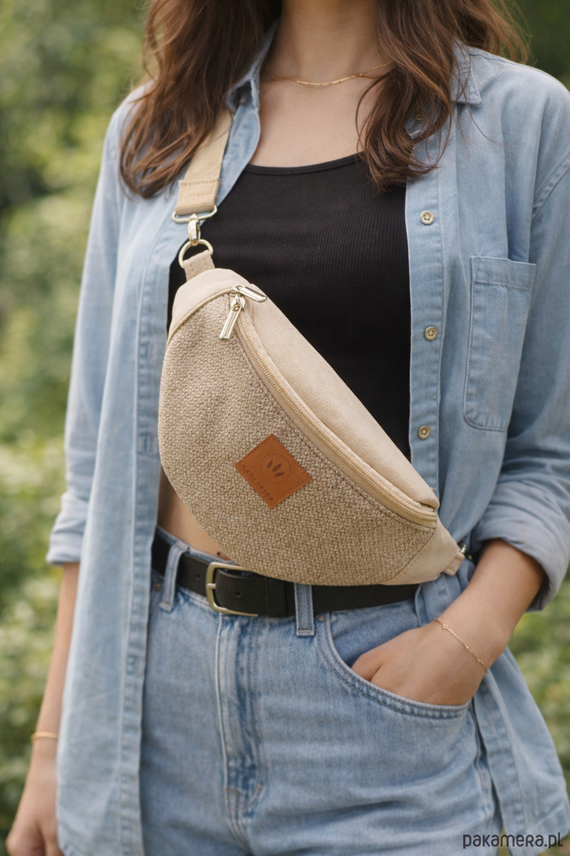 Torebka nerka wykonana z grubo plecionej tkaniny oraz nubuku wodoodpornego.