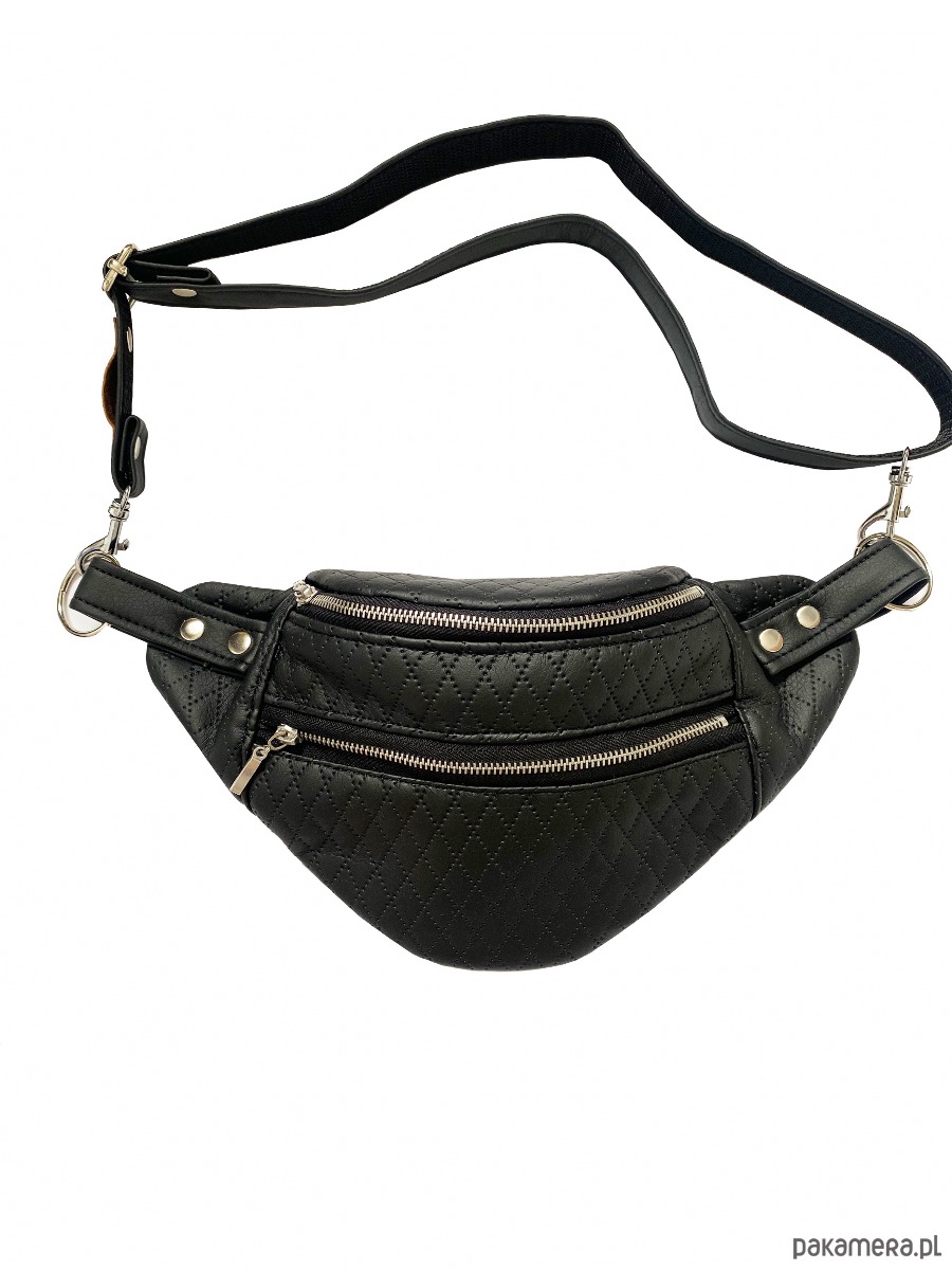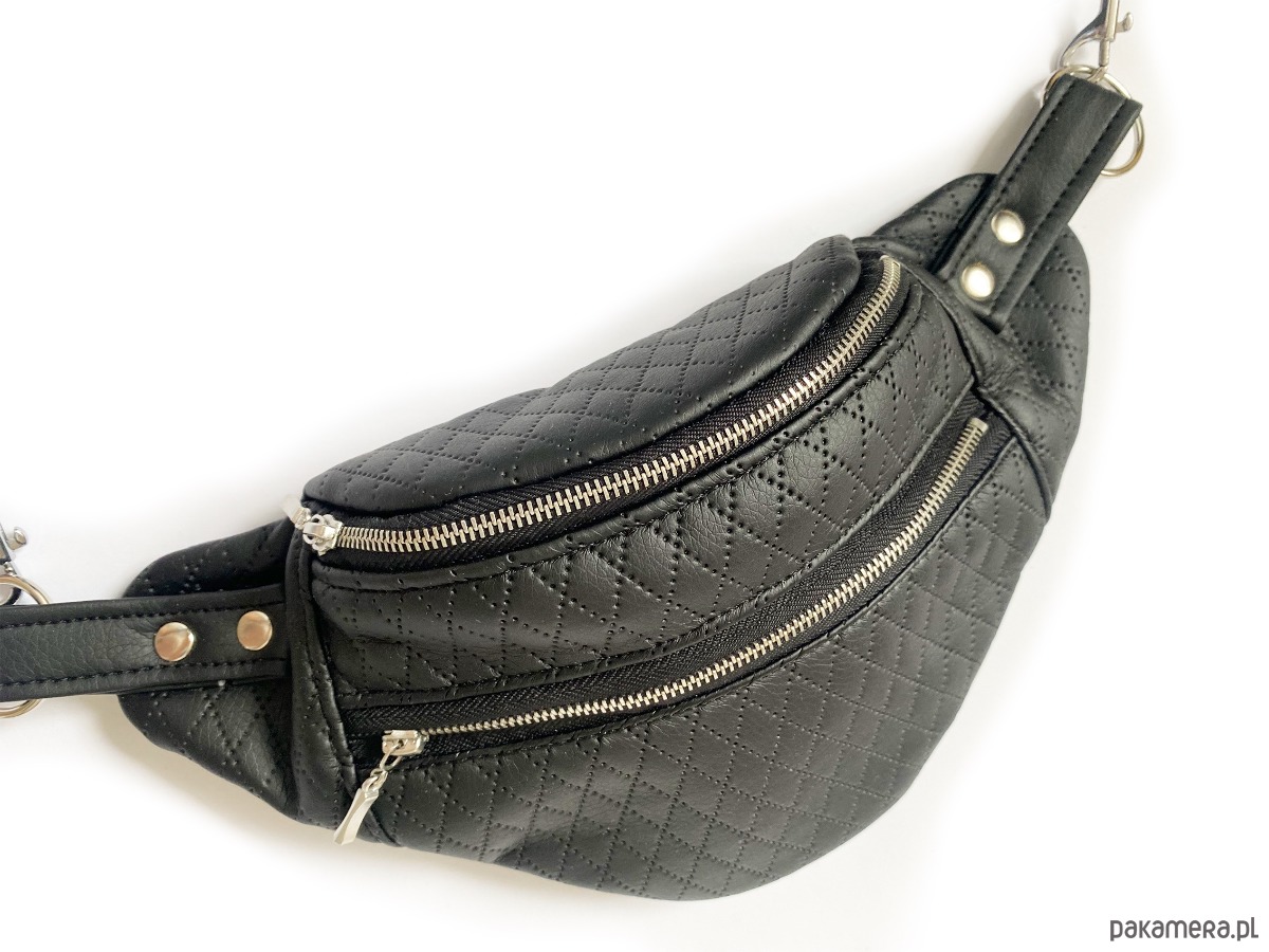 Saszetka na pas wykonana z tapicerskiego pikowanego materiału.Zapinana jest na y karabińczyk na regulowanym pasku wykonanym z eko skóry podszytej paskiem parcianym dla wzmocnienia.