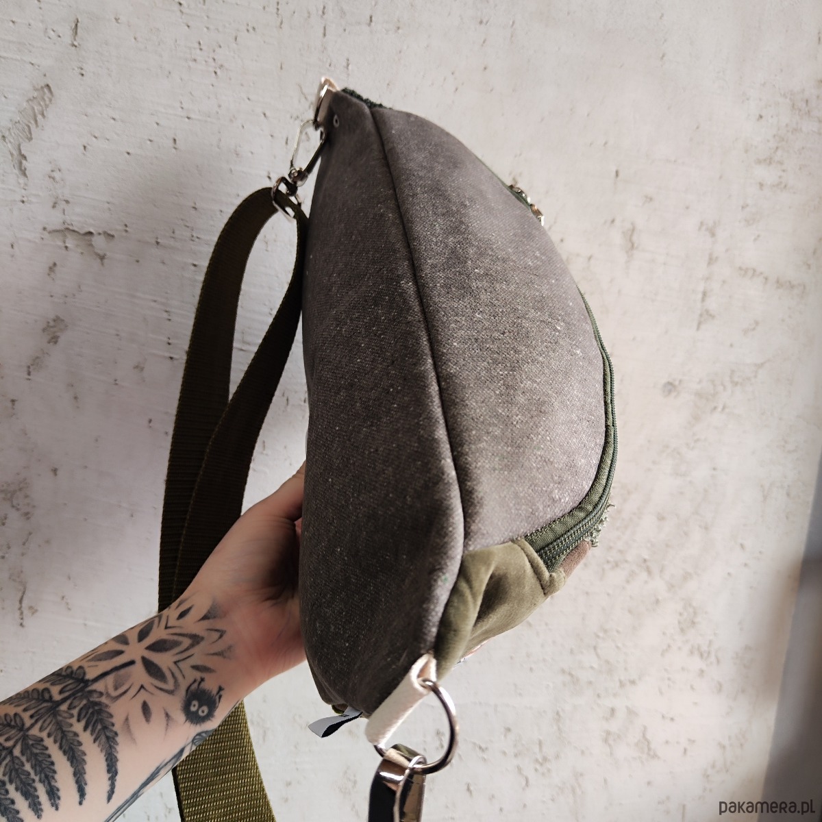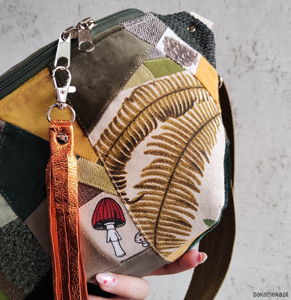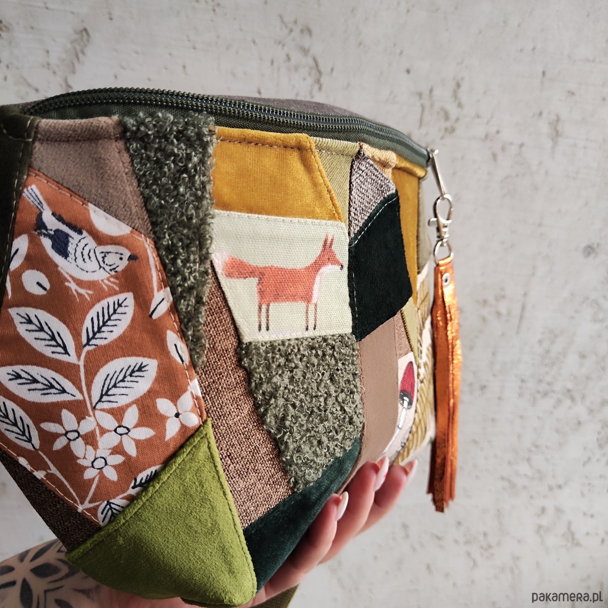 Nerka uszyta końcówek tkanin, przez co jest unikatowa - tylko 1 sztuka! Regulowany pasek nośny z możliwością wymiany (nerka posiada po bokach 2 metalowe półkola, które umożliwiają szybkie zapinanie/ wymianę paska np. na inny kolor). Wymiary: 34cmx20cmx10cm (+/-1cm). W środku kieszonka zapinana na zamek. Pasek do nerki zapinany oddzielnie (tak jak w nerkach mini oraz XXL), obwód minimalny z nerką ok. 104cm, maksymalny 148cm. Nerka gigant (jeszcze większa od nerki XXL) idealnie nadaje się do noszenia z tyłu na plecach. Pomieści najpotrzebniejsze rzeczy podczas spacerów (wejdzie nawet mała butelka z wodą oraz składana parasolka).