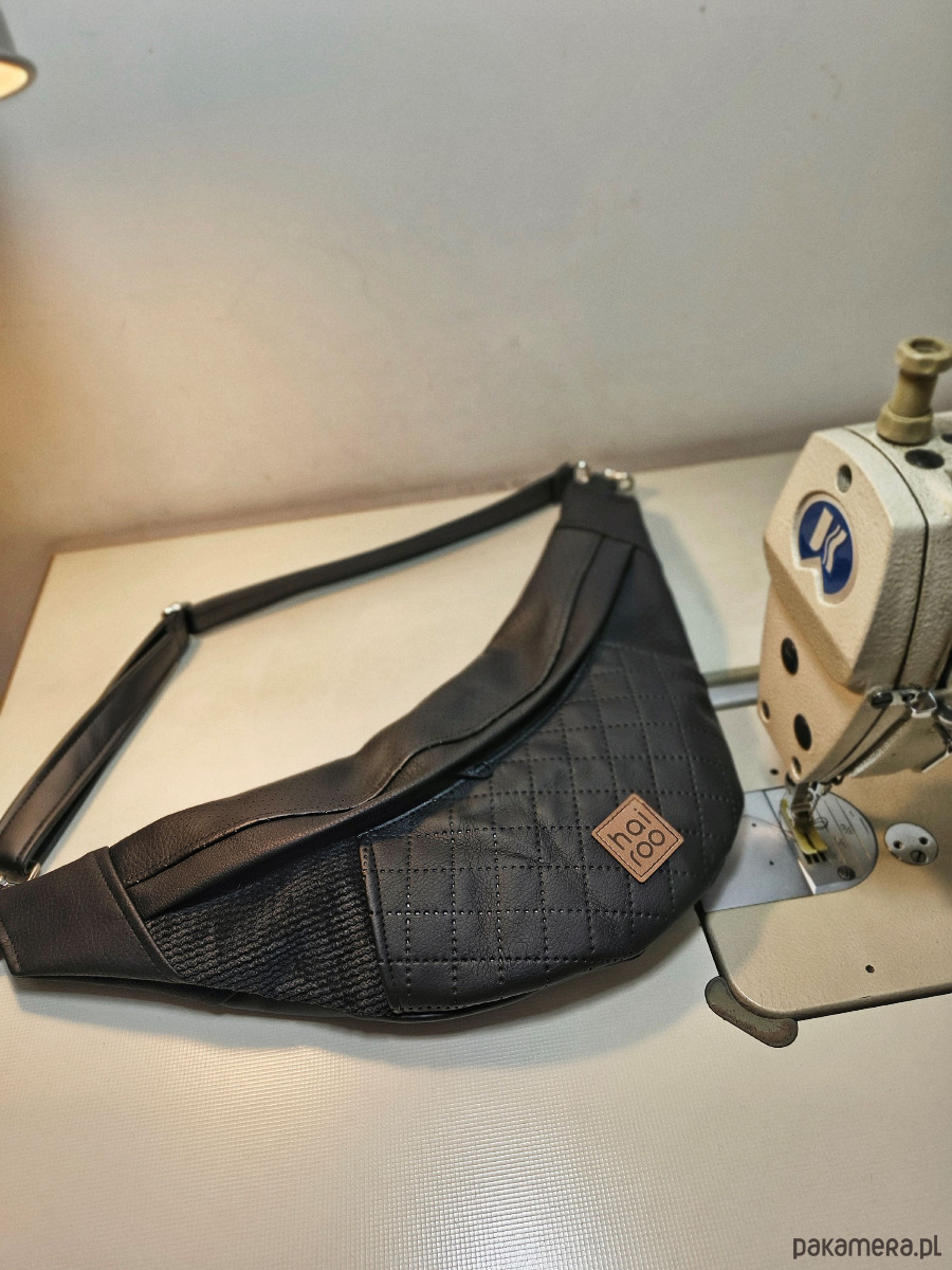 Została wykonana ze ścinków czarnych ekoskór w duchu no waste.