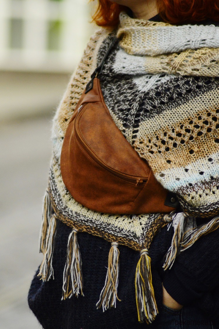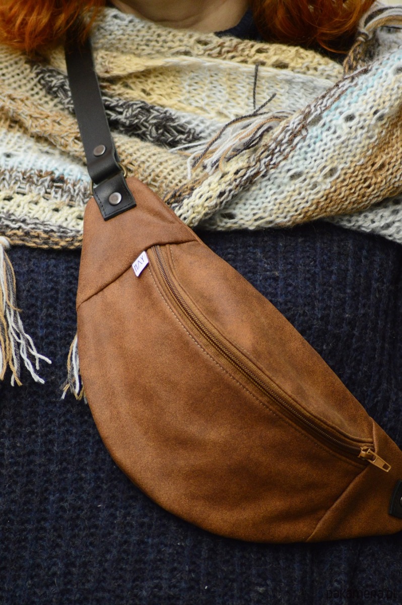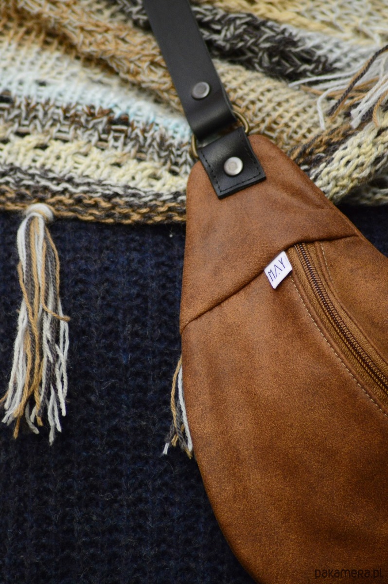 Nerka dużych rozmiarów ( spokojnie pomieści duży telefon i średniej wielkości portfel) powstała z tkaniny tapicerskiej o fakturze nubuku dodatkowo wzmocnionej warstwą wodoodporną. Wewnątrz znajduje się bawełniana podszewka z małą kieszonką na suwak. Pasek wykonany jest ze skóry naturalnej, zapina się na karabińczyk oraz posiada regulację na klamrę.