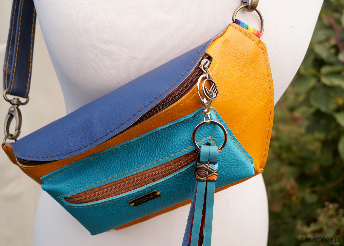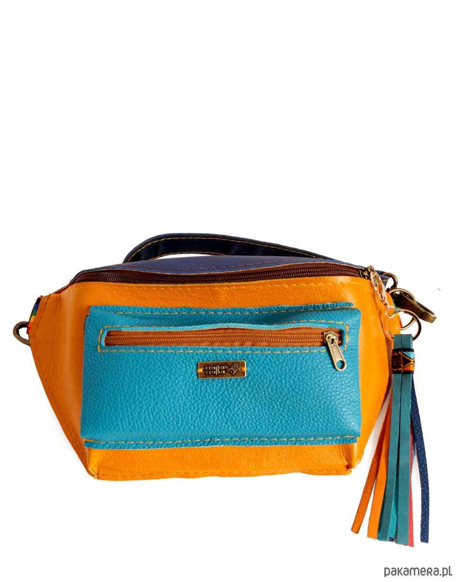 Nerka o klasycznym, podłużnym kroju, uszyta ze świetnej jakości skór naturalnych, bydlęcych, licowych w kolorach pomarańcz, granat, turkus. Składa się z dużej, głównej komory, zamykanej zamkiem błyskawicznym, pojemnej kieszeni przedniej oraz kieszeni tylnej. W komplecie odpinany frędzel. Uszyta z dużą dbałością o każdy szczegół. Wymiary: wysokość – 15, szerokość – 30, głębokość – 7, dł. regulowanego paska – 66-115cm.