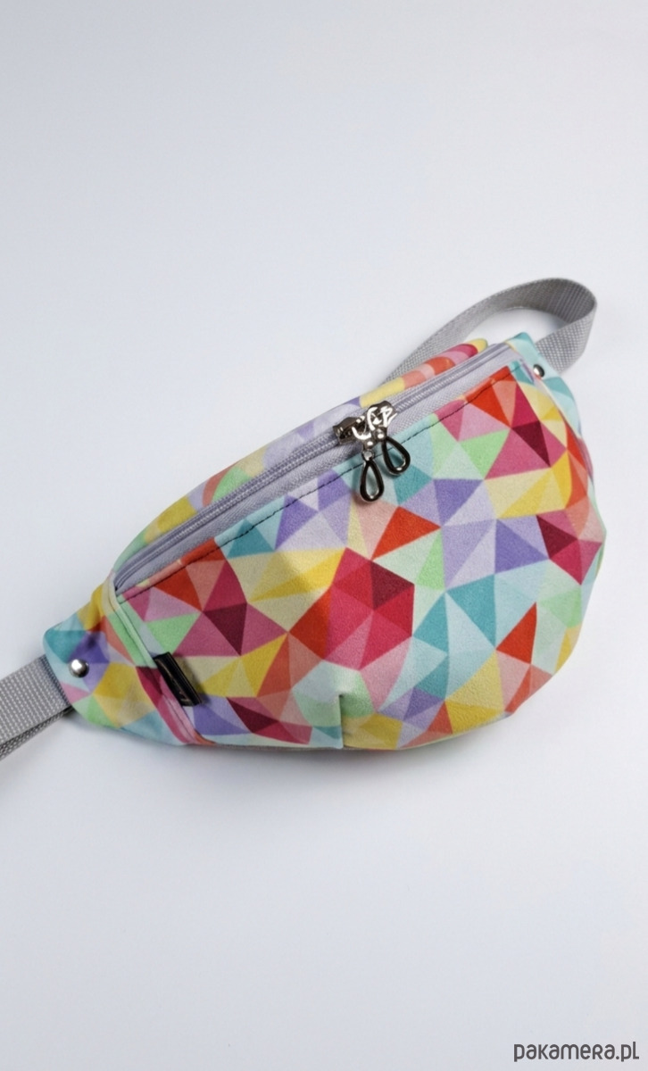 Kolorowa nerka zapinana na zamek. Saszetka ma pastelowy, geometryczny wzór w odcieniach różu, żółci, zieleni i fioletu, co nadaje jej lekki, wakacyjny charakter. Pasek w jasnoszarym kolorze. Nerka idealna na spacer lub letnie wyjście.