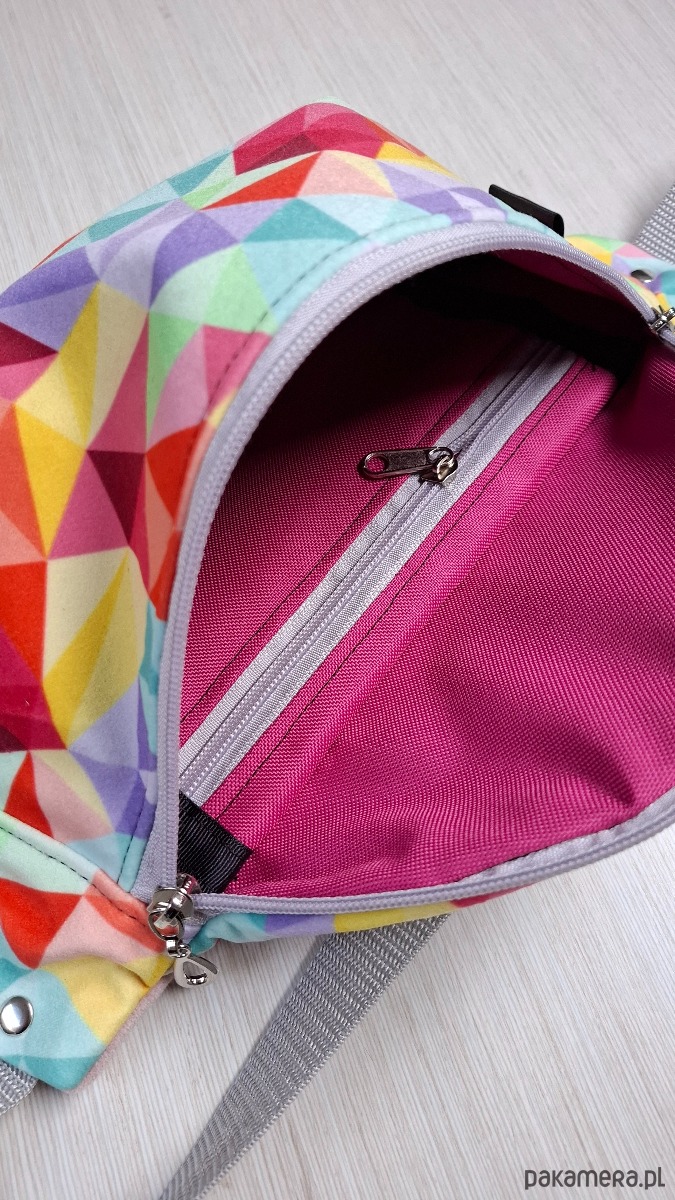 Uszyta z resztek tkanin wodoodpornych, tkanina typu welur. Tył nerki w kolorze jasnym różowym.